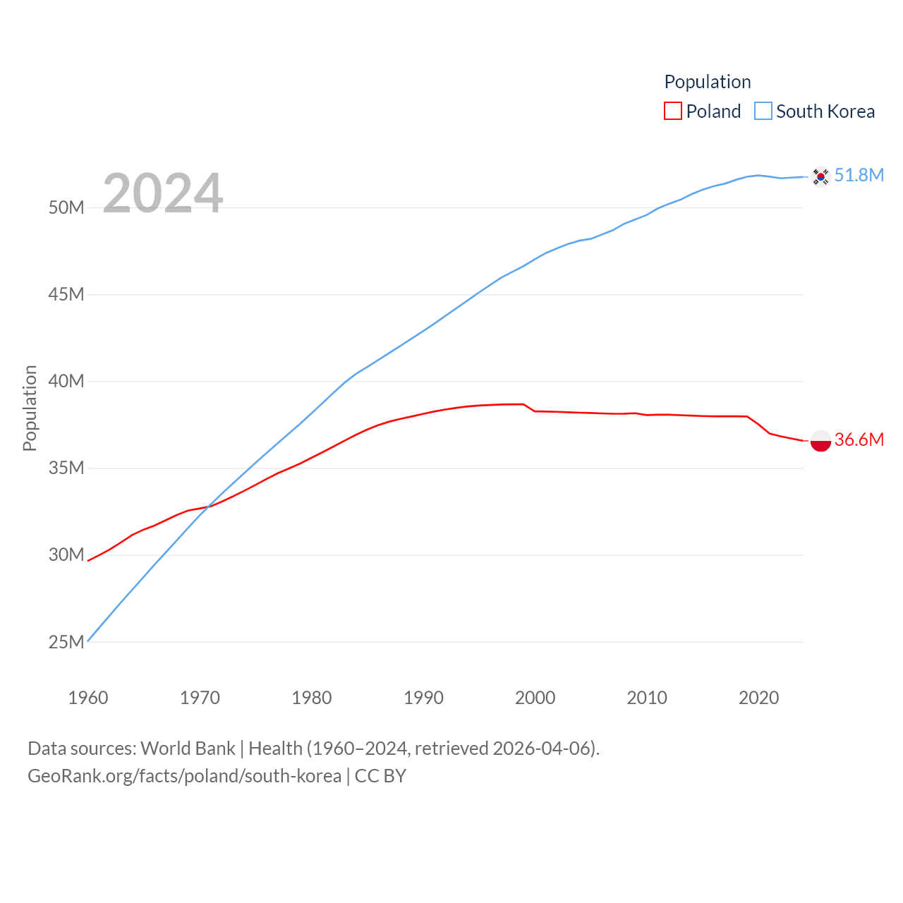 Poland has a population of 36.6M (ranked 42/197), compared with 51.8M in South Korea (ranked 29/197). Poland's land area is 118,252 sq mi versus 37,684 sq mi for South Korea (ranked 69th vs. 105th).