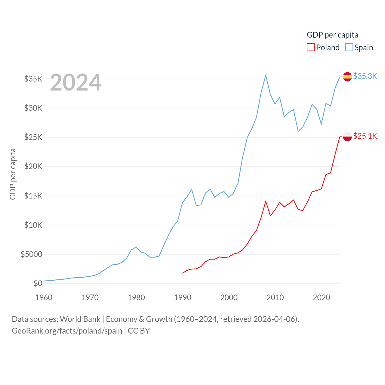 By GDP, Poland ranks 21/197 ($918B) and Spain ranks 15/197 ($1.73T). By GDP per capita, Poland ranks 48/197 ($25,104), while Spain ranks 32/197 ($35,327).