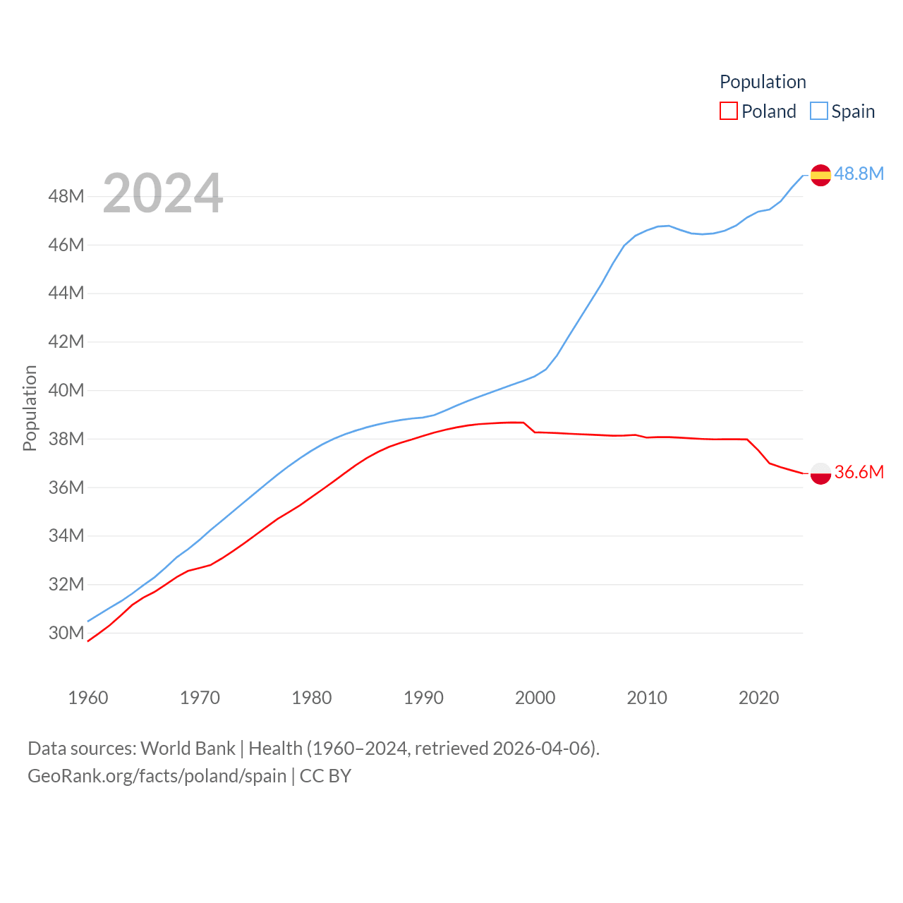 Poland has a population of 36.6M (ranked 42/197), compared with 48.8M in Spain (ranked 32/197). Poland's land area is 118,252 sq mi versus 192,934 sq mi for Spain (ranked 69th vs. 51st).