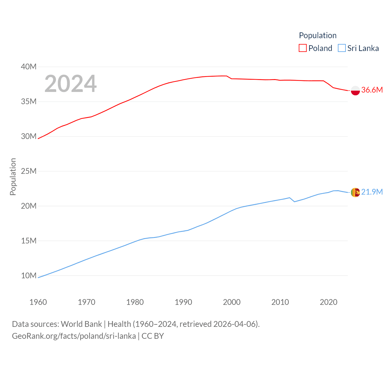 Poland has a population of 36.6M (ranked 42/197), compared with 21.9M in Sri Lanka (ranked 61/197). Poland's land area is 118,252 sq mi versus 23,884 sq mi for Sri Lanka (ranked 69th vs. 122nd).