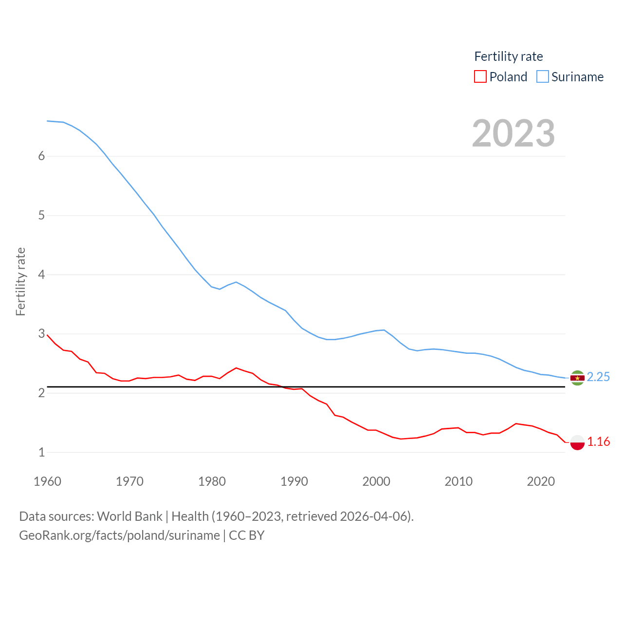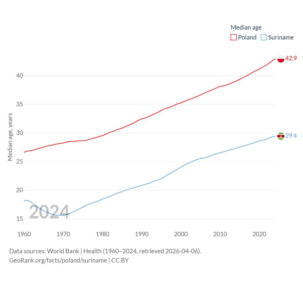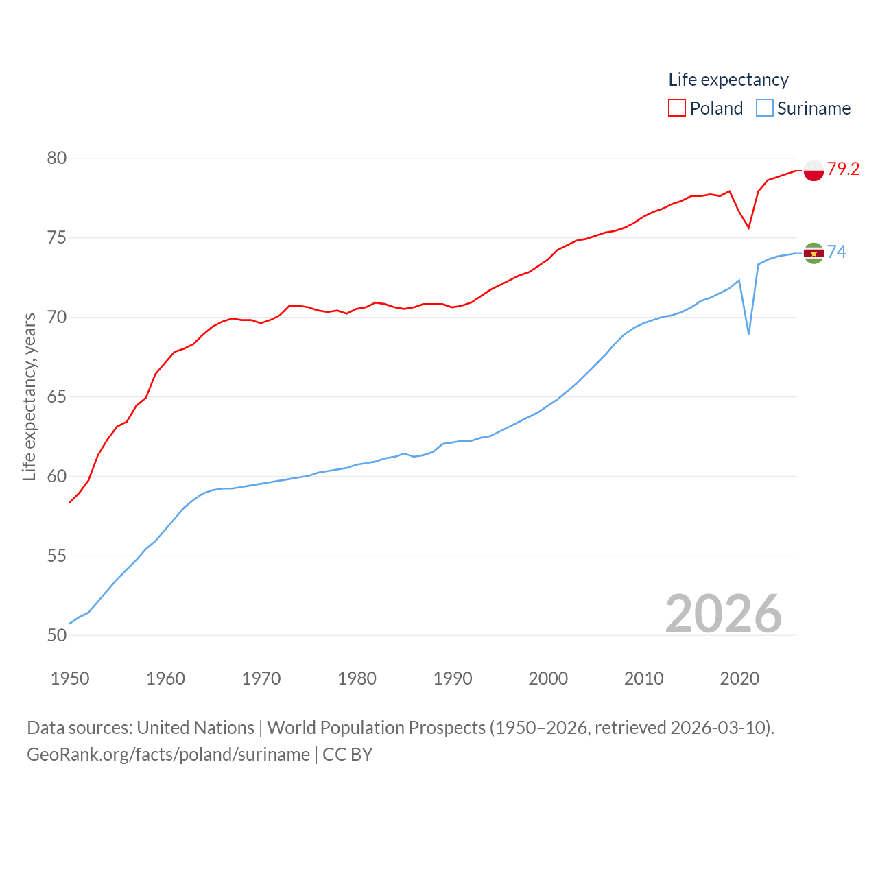 Poland has a population of 36.6M (ranked 42/197), compared with 634K in Suriname (ranked 165/197). Poland's land area is 118,252 sq mi versus 61,972 sq mi for Suriname (ranked 69th vs. 90th).