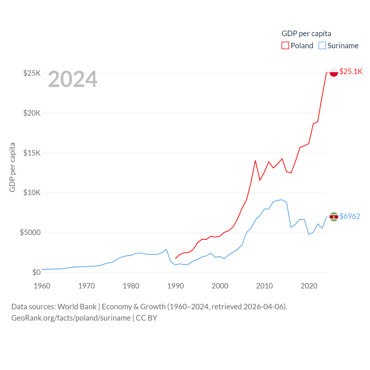 By GDP, Poland ranks 21/197 ($918B) and Suriname ranks 164/197 ($4.42B). By GDP per capita, Poland ranks 48/197 ($25,104), while Suriname ranks 102/197 ($6,962).