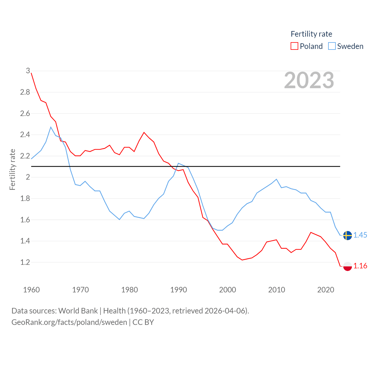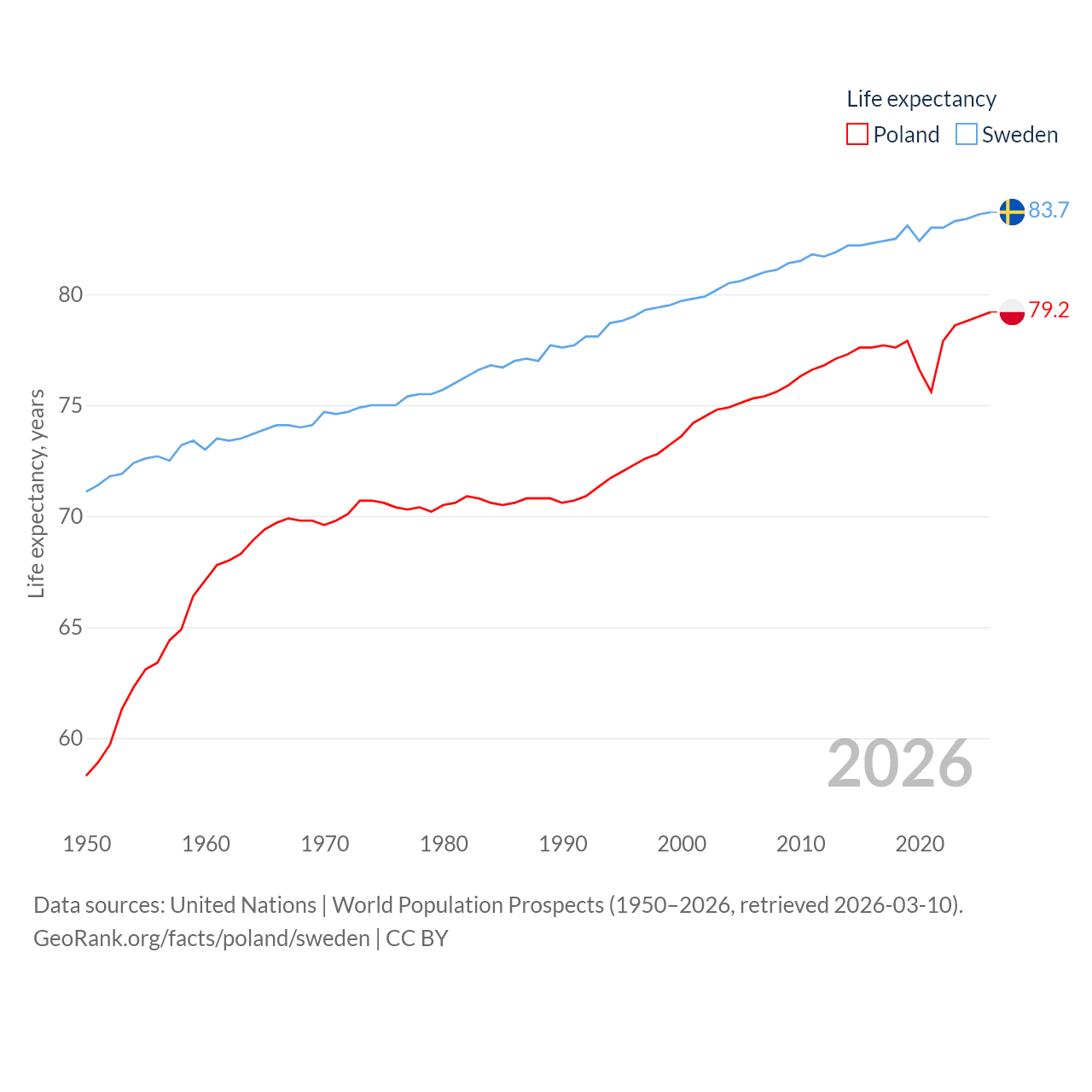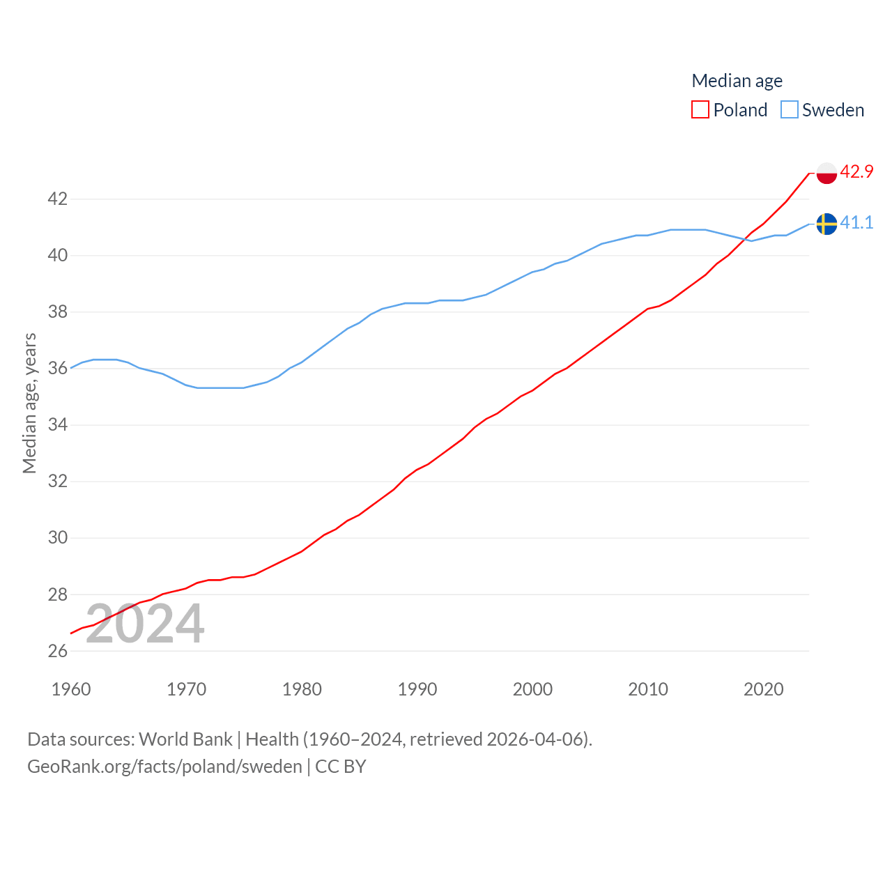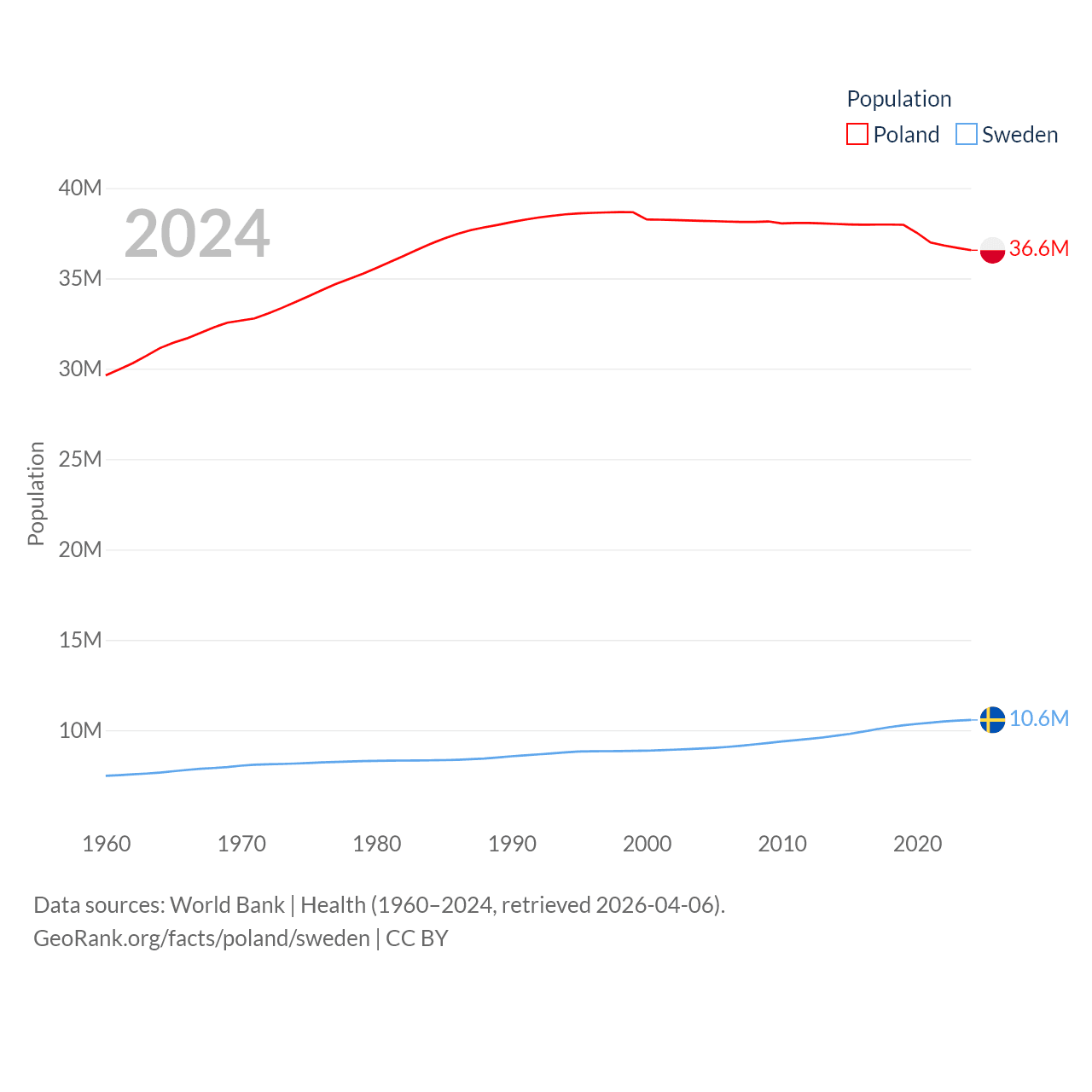Poland has a population of 36.6M (ranked 42/197), compared with 10.6M in Sweden (ranked 93/197). Poland's land area is 118,252 sq mi versus 157,248 sq mi for Sweden (ranked 69th vs. 58th).