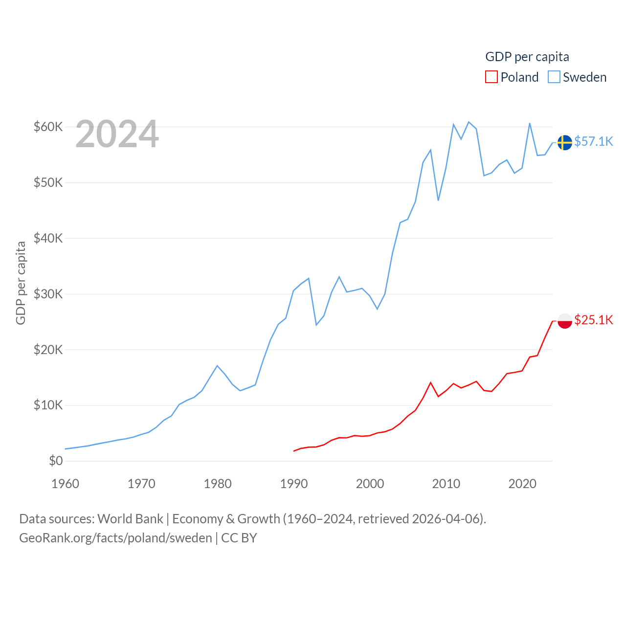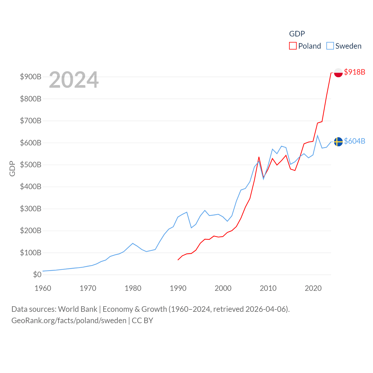 By GDP, Poland ranks 21/197 ($918B) and Sweden ranks 26/197 ($604B). By GDP per capita, Poland ranks 48/197 ($25,104), while Sweden ranks 17/197 ($57,117).