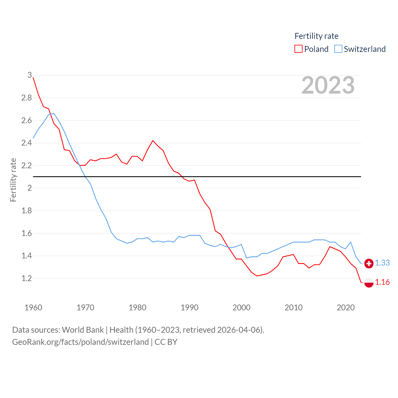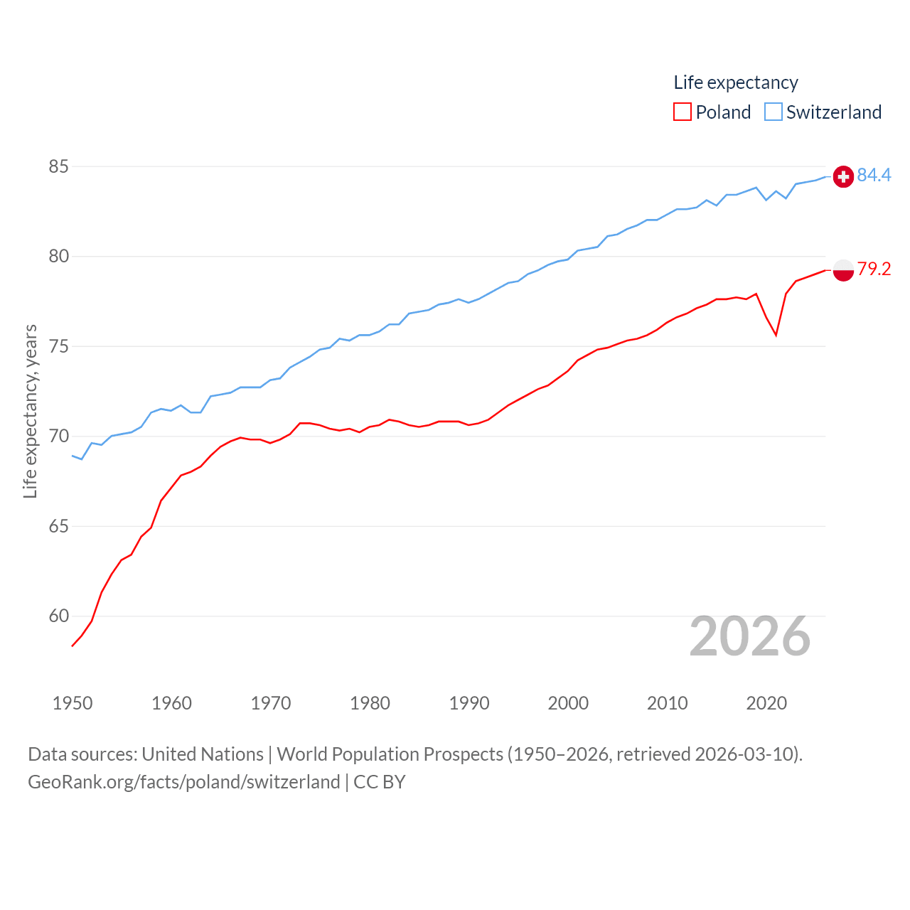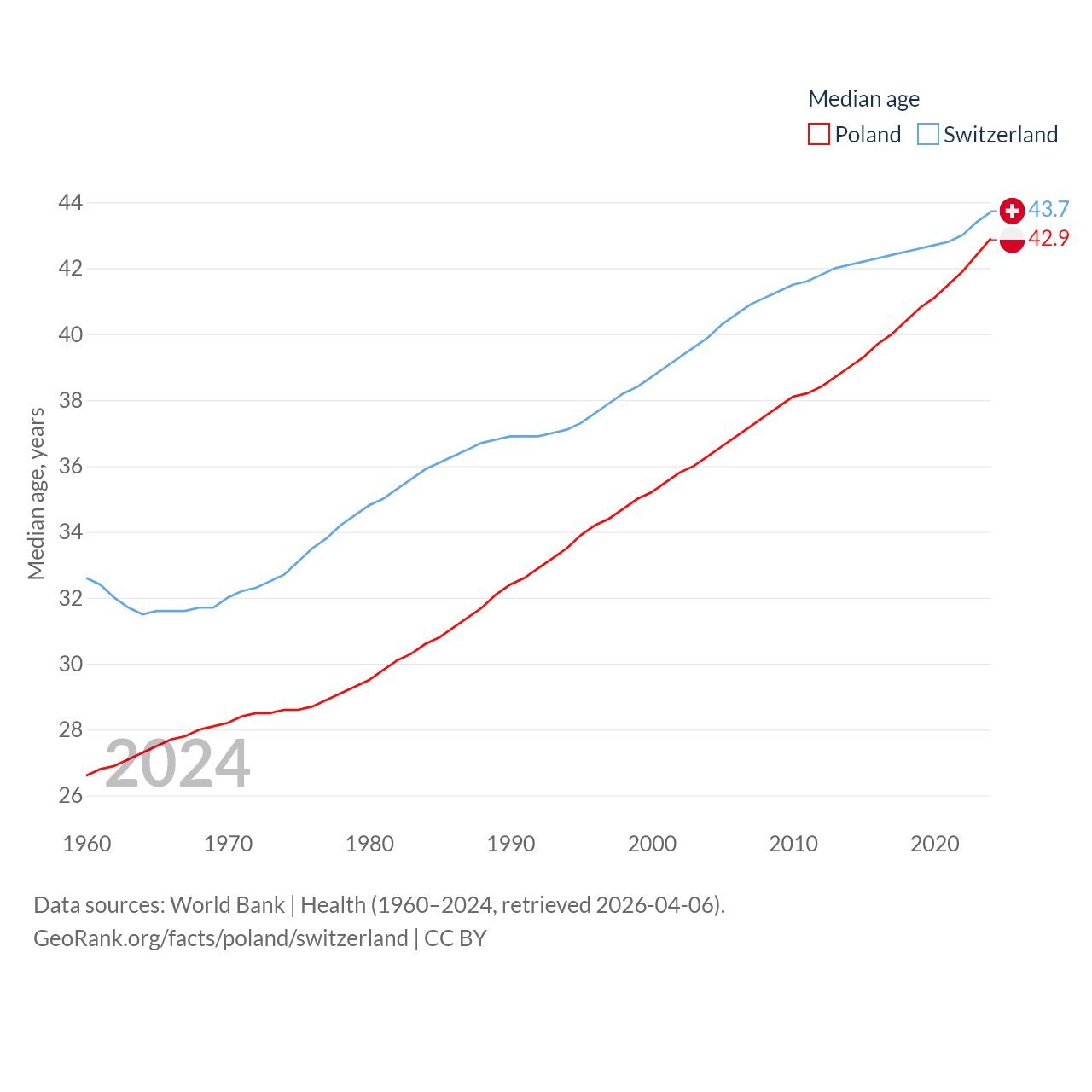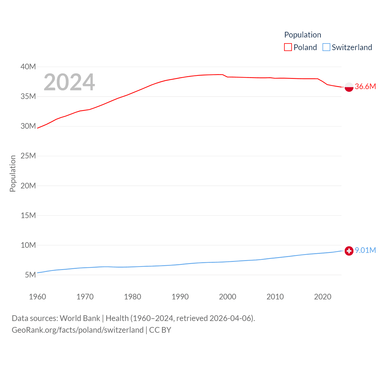 Poland has a population of 36.6M (ranked 42/197), compared with 9.01M in Switzerland (ranked 101/197). Poland's land area is 118,252 sq mi versus 15,255 sq mi for Switzerland (ranked 69th vs. 131st).