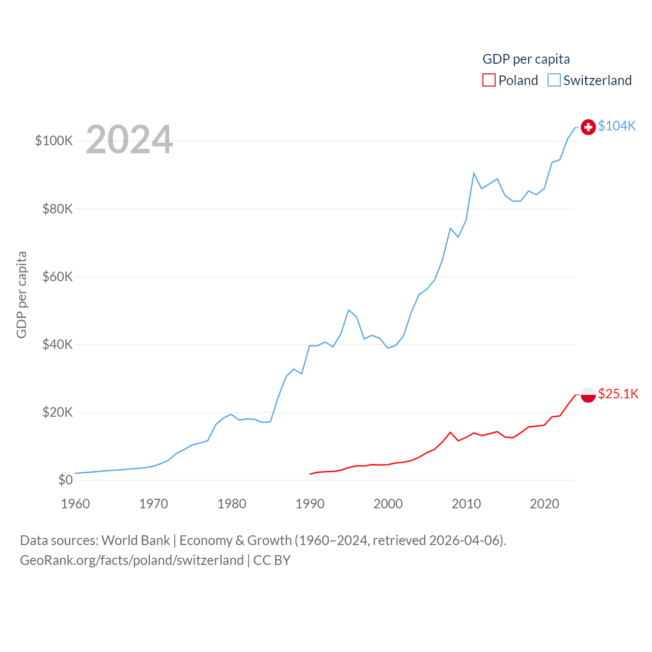By GDP, Poland ranks 21/197 ($918B) and Switzerland ranks 20/197 ($937B). By GDP per capita, Poland ranks 48/197 ($25,104), while Switzerland ranks 5/197 ($103,998).