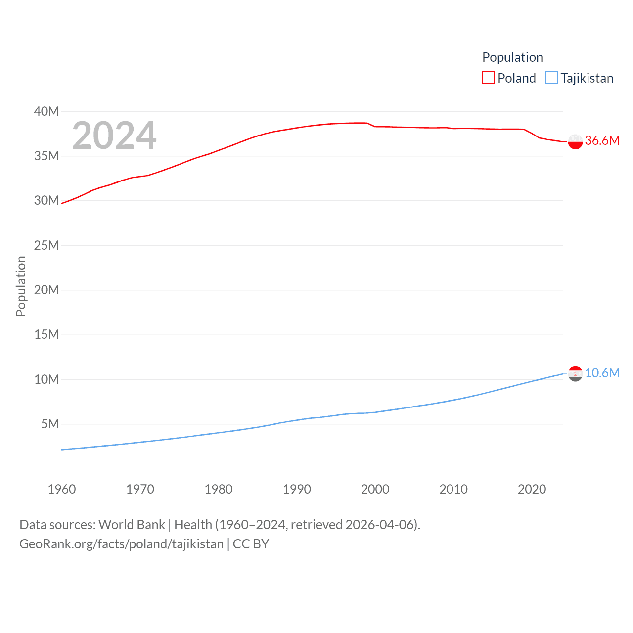Poland has a population of 36.6M (ranked 42/197), compared with 10.6M in Tajikistan (ranked 91/197). Poland's land area is 118,252 sq mi versus 53,587 sq mi for Tajikistan (ranked 69th vs. 93rd).