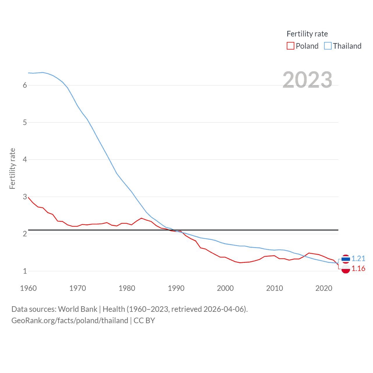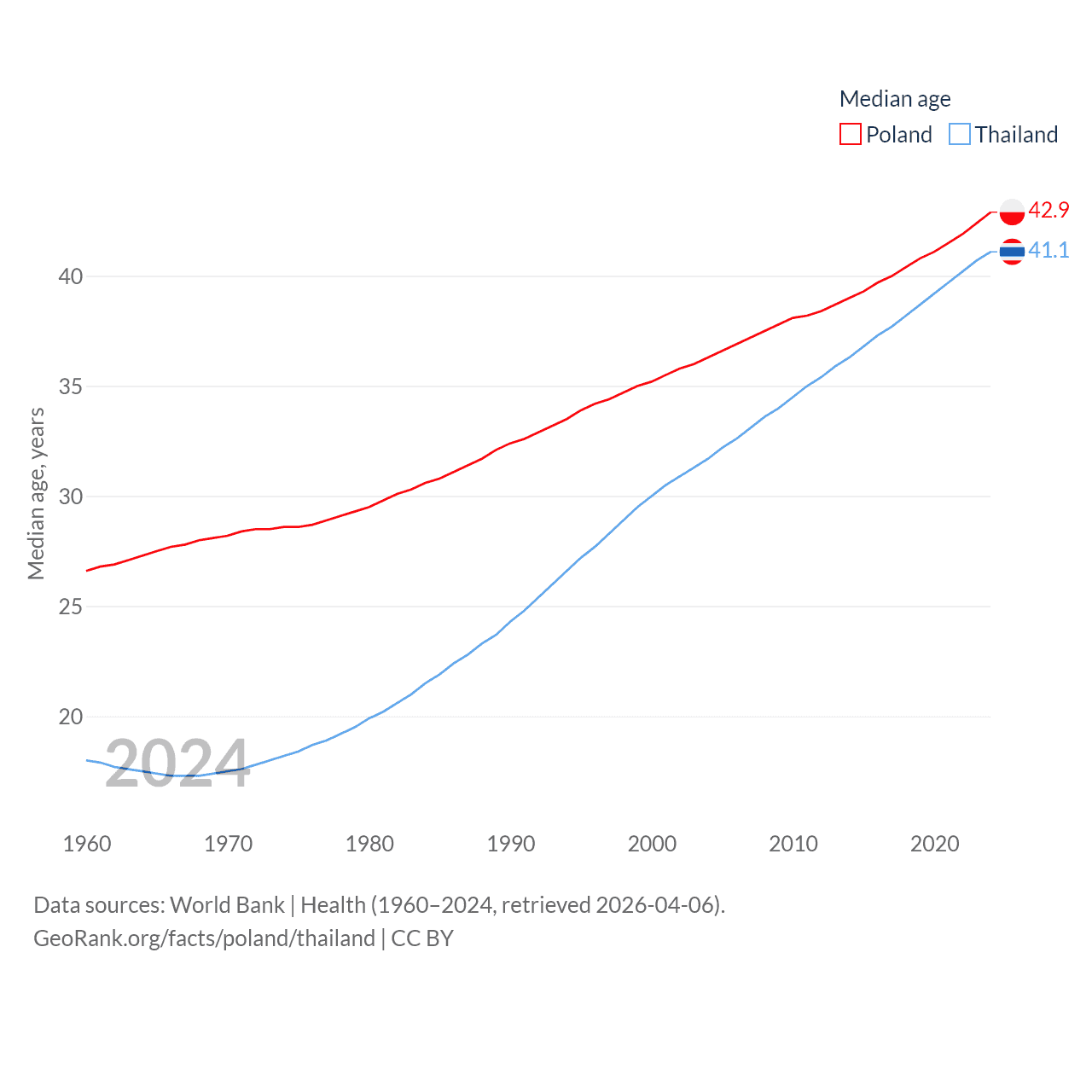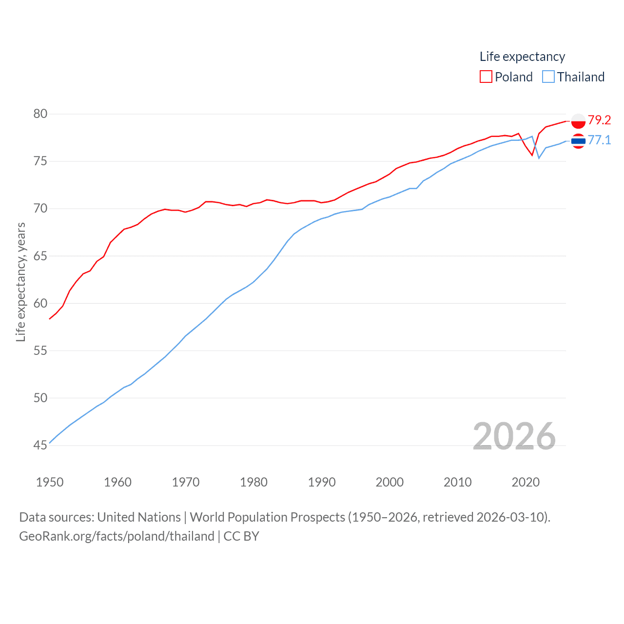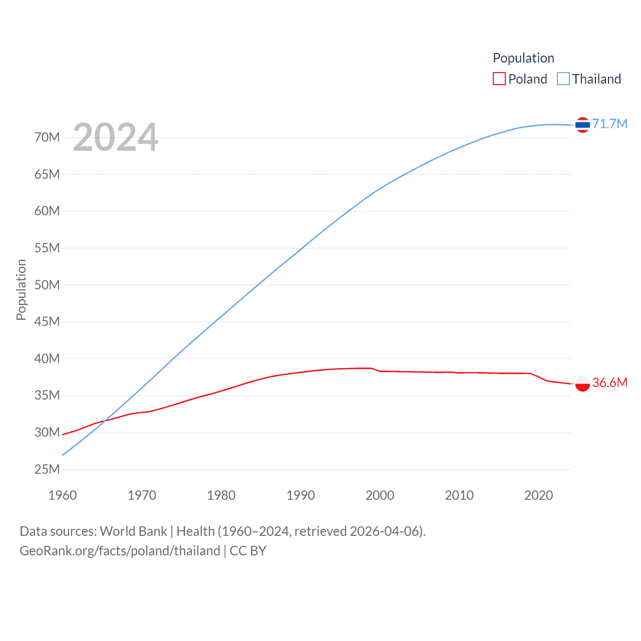 Poland has a population of 36.6M (ranked 42/197), compared with 71.7M in Thailand (ranked 20/197). Poland's land area is 118,252 sq mi versus 197,256 sq mi for Thailand (ranked 69th vs. 50th).