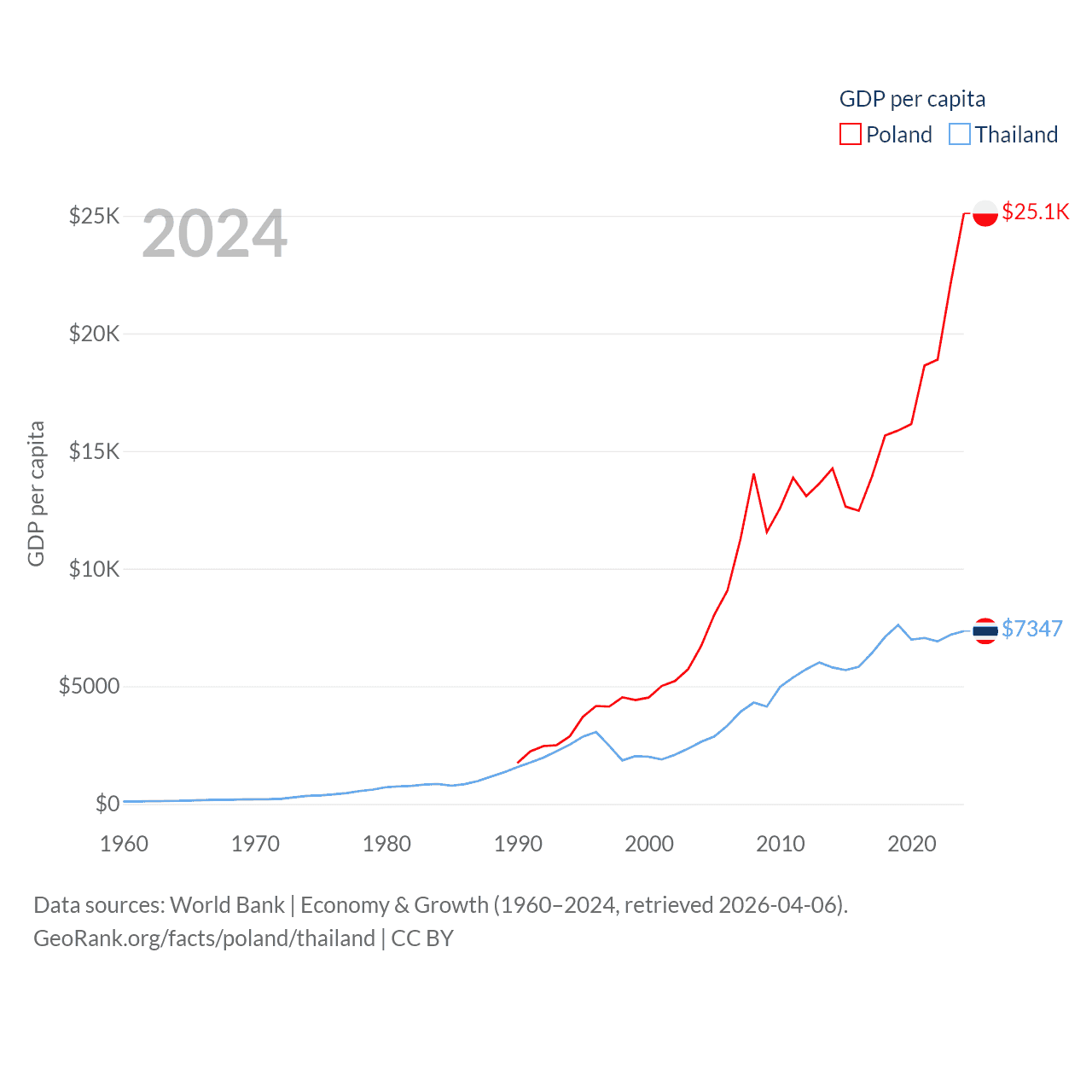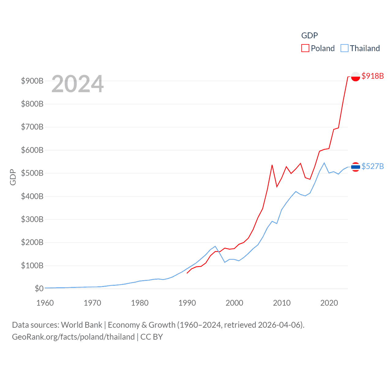 By GDP, Poland ranks 21/197 ($918B) and Thailand ranks 31/197 ($527B). By GDP per capita, Poland ranks 48/197 ($25,104), while Thailand ranks 100/197 ($7,347).