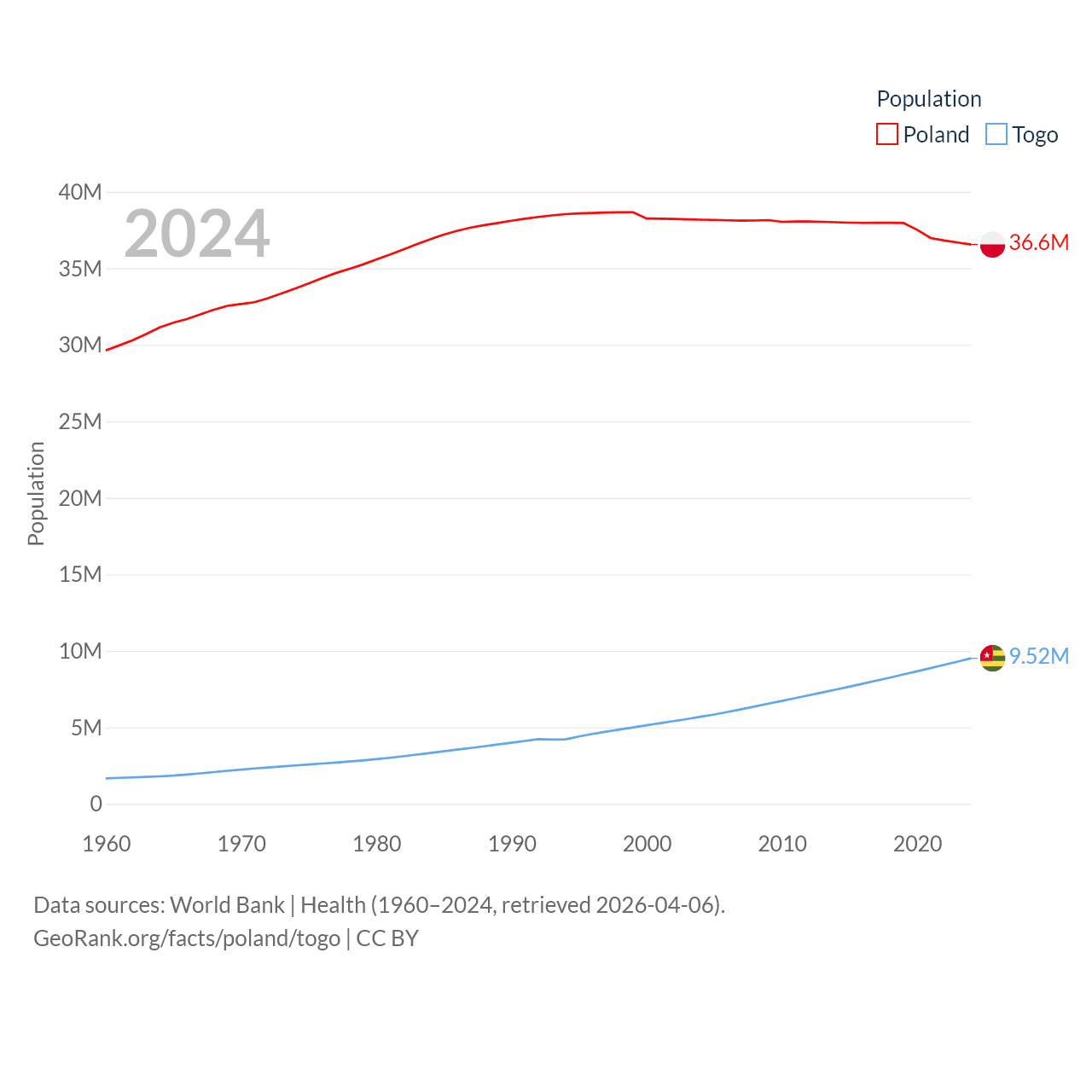 Poland has a population of 36.6M (ranked 42/197), compared with 9.52M in Togo (ranked 98/197). Poland's land area is 118,252 sq mi versus 21,000 sq mi for Togo (ranked 69th vs. 124th).