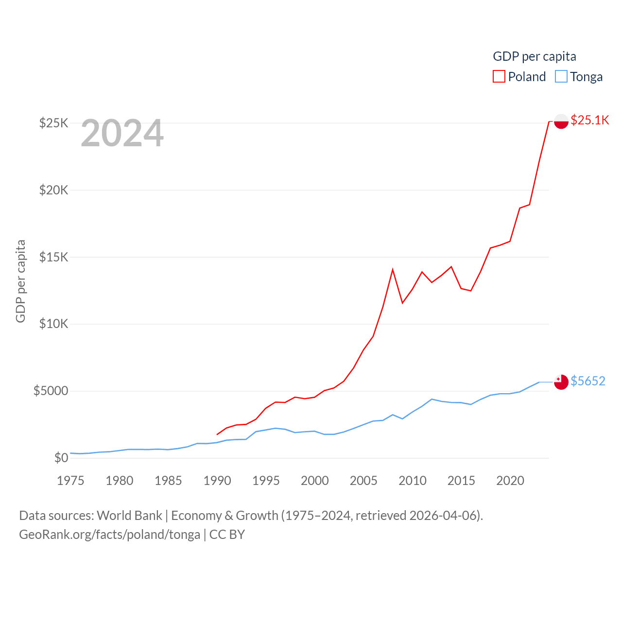 By GDP, Poland ranks 21/197 ($918B) and Tonga ranks 191/197 ($591M). By GDP per capita, Poland ranks 48/197 ($25,104), while Tonga ranks 115/197 ($5,652).