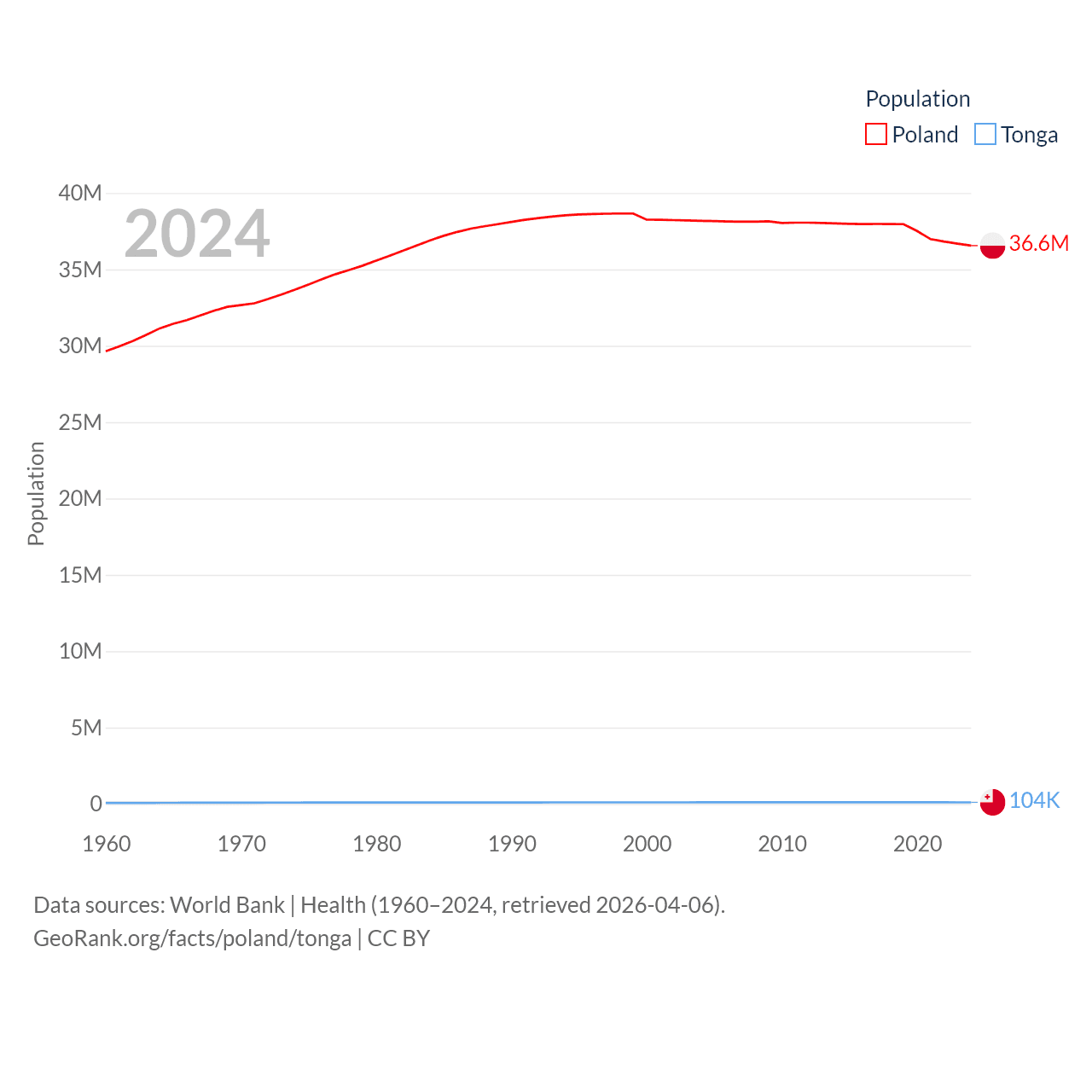 Poland has a population of 36.6M (ranked 42/197), compared with 104K in Tonga (ranked 183/197). Poland's land area is 118,252 sq mi versus 278 sq mi for Tonga (ranked 69th vs. 176th).