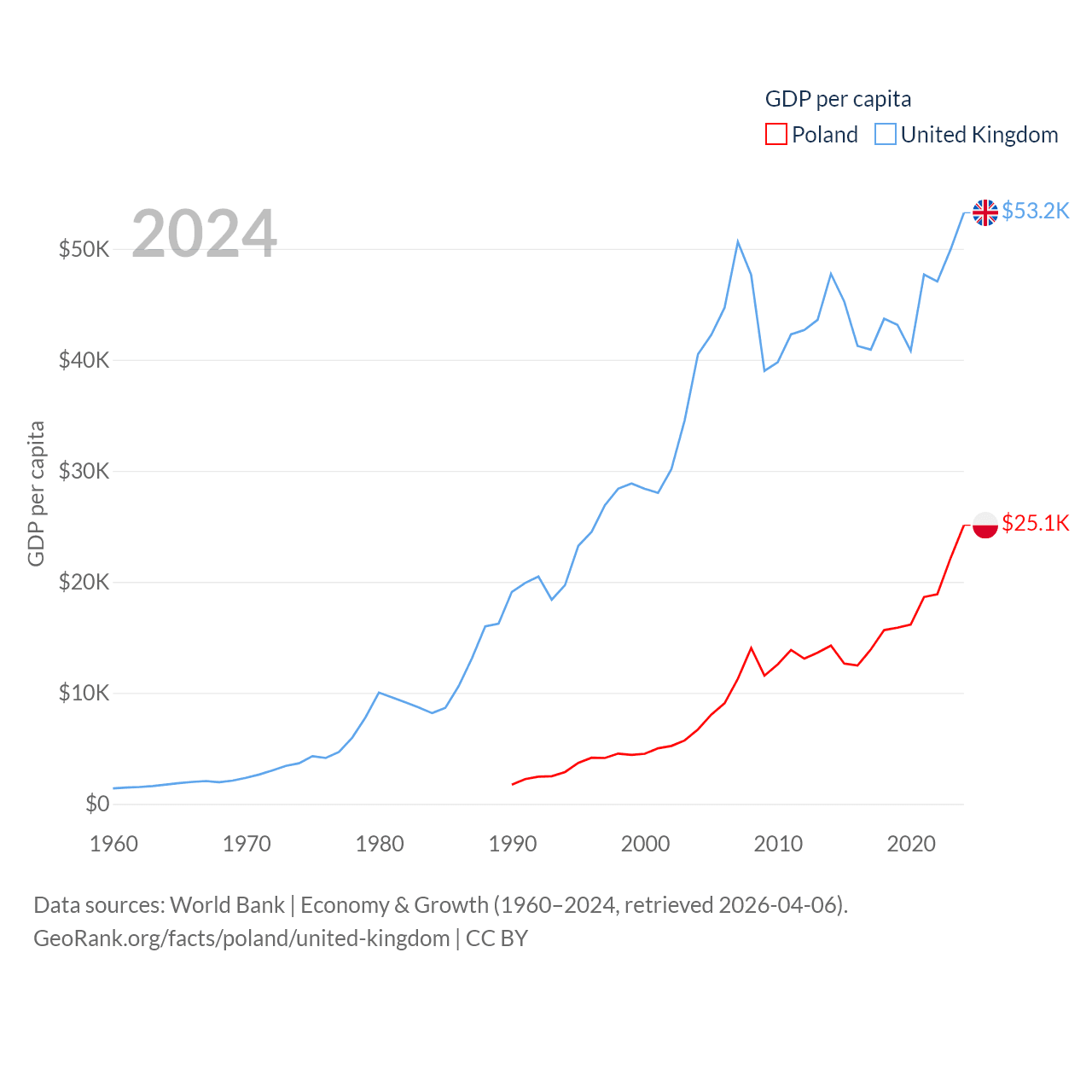 By GDP, Poland ranks 21/197 ($918B) and The United Kingdom ranks 6/197 ($3.69T). By GDP per capita, Poland ranks 48/197 ($25,104), while The United Kingdom ranks 22/197 ($53,246).