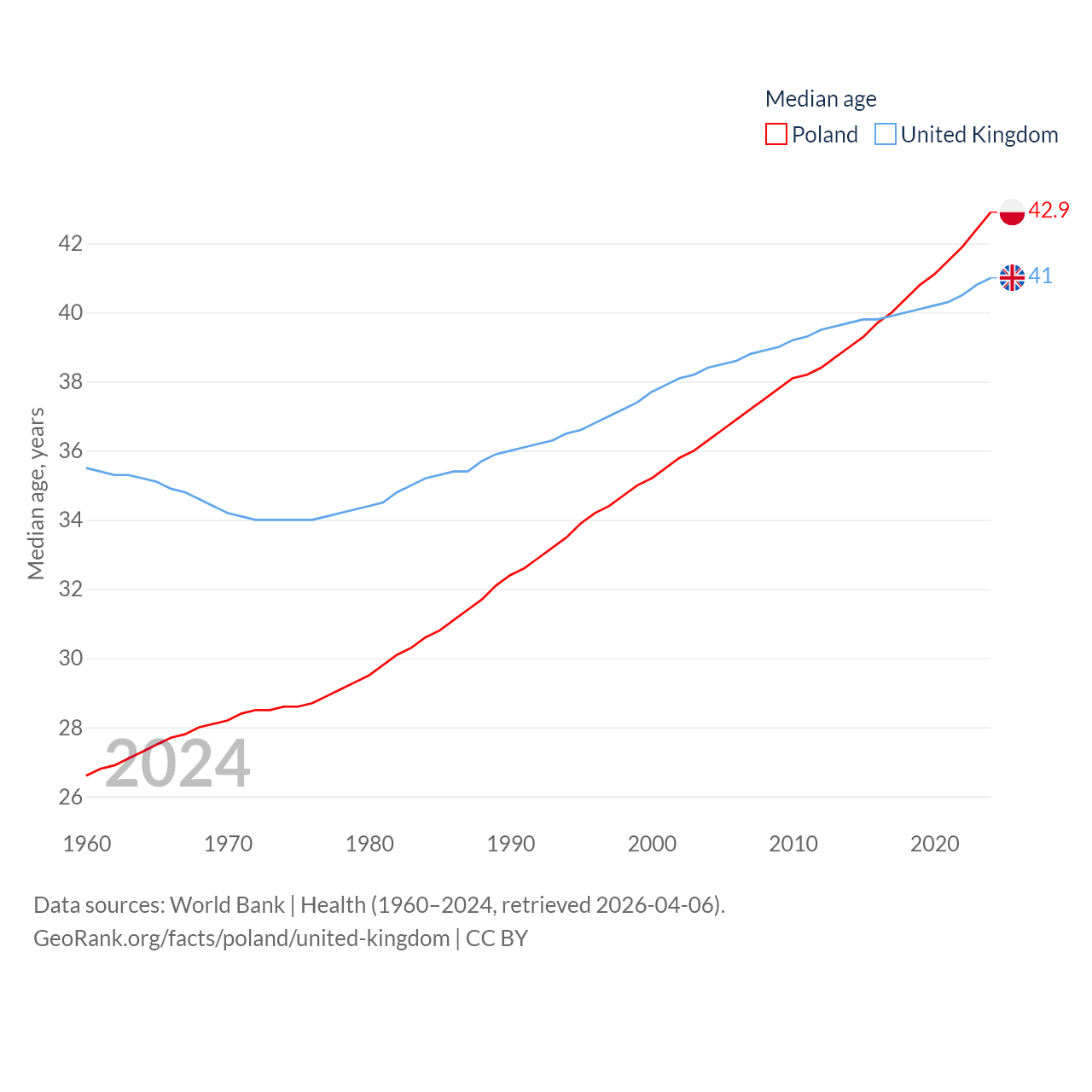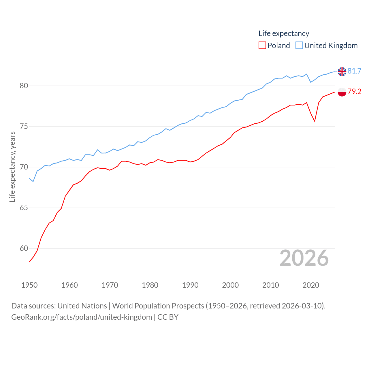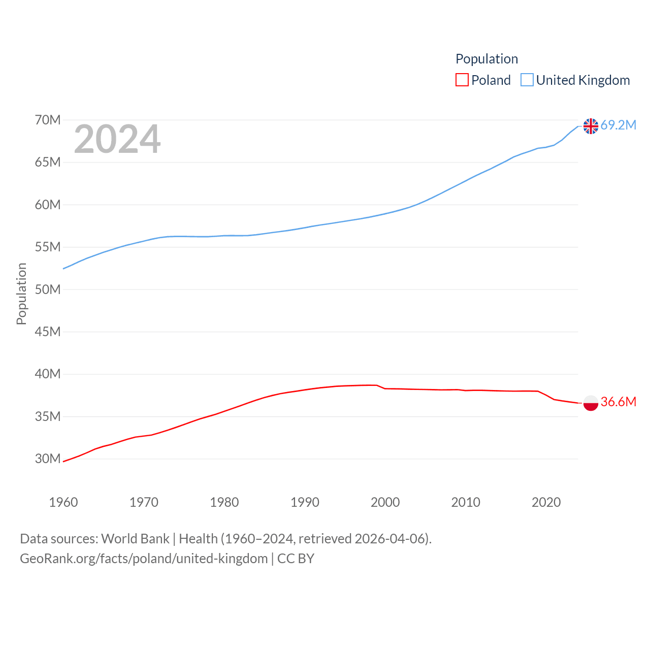 Poland has a population of 36.6M (ranked 42/197), compared with 69.2M in The United Kingdom (ranked 21/197). Poland's land area is 118,252 sq mi versus 93,410 sq mi for The United Kingdom (ranked 69th vs. 78th).