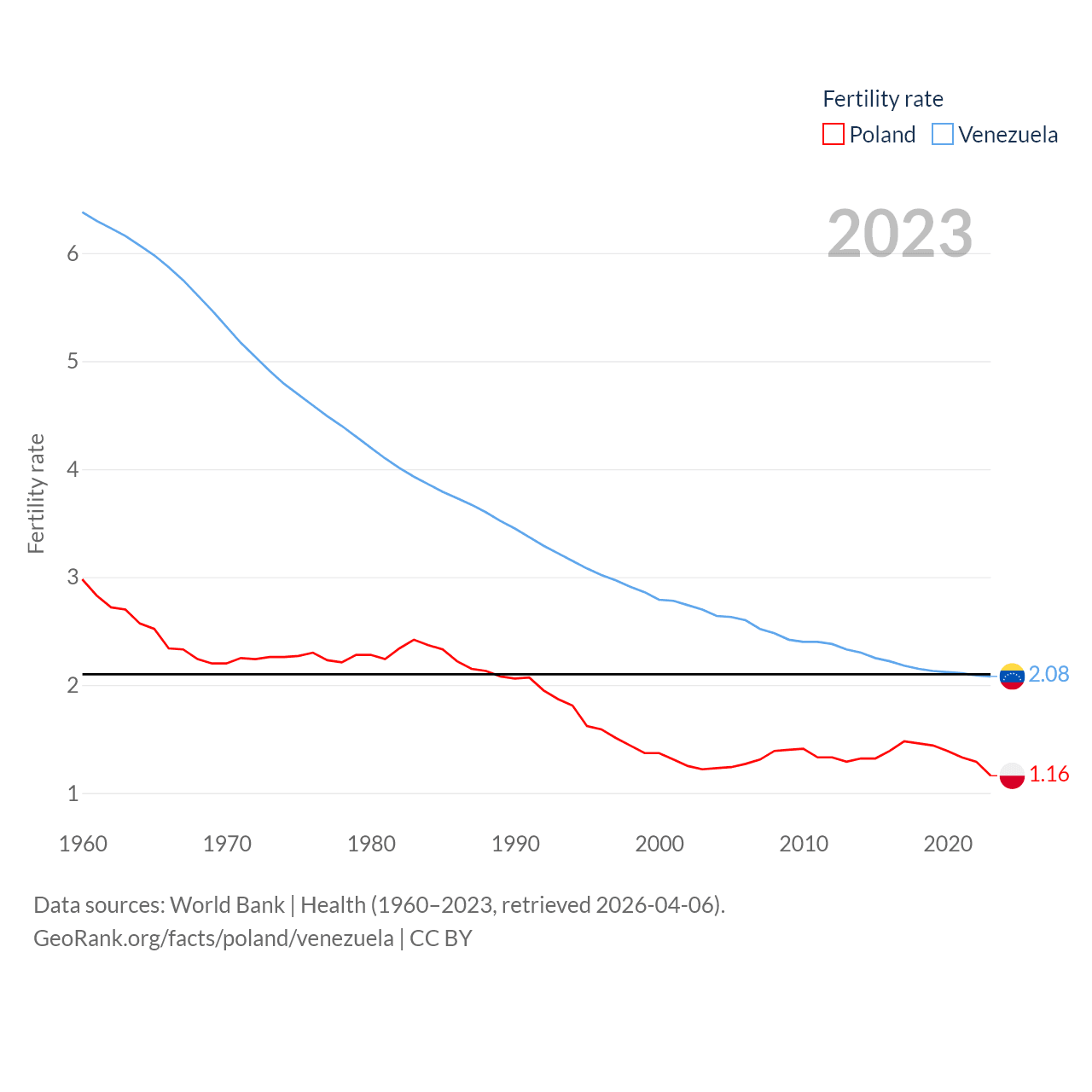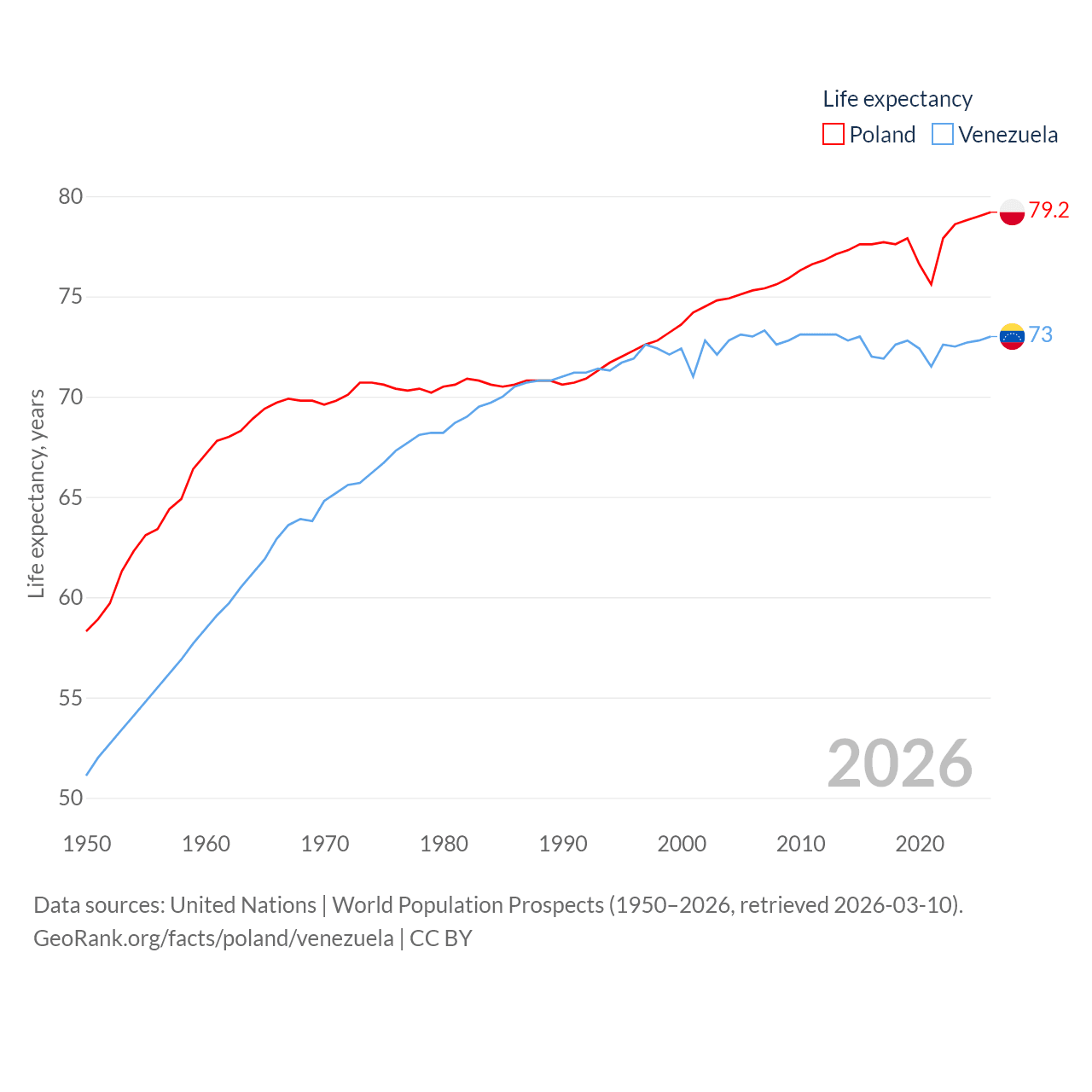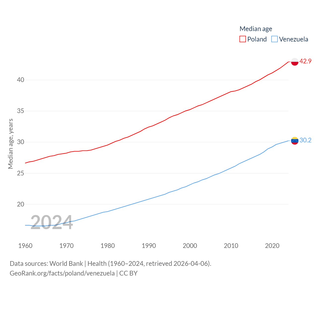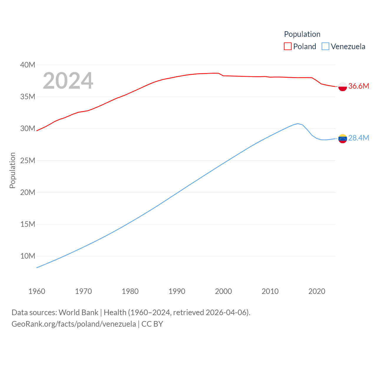 Poland has a population of 36.6M (ranked 42/197), compared with 28.4M in Venezuela (ranked 53/197). Poland's land area is 118,252 sq mi versus 340,561 sq mi for Venezuela (ranked 69th vs. 32nd).
