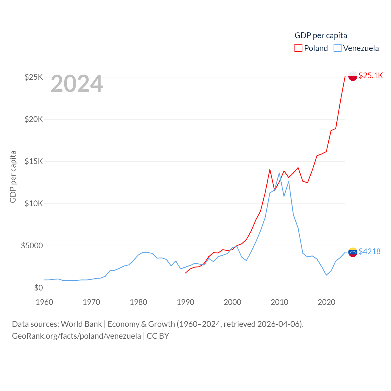 By GDP, Poland ranks 21/197 ($918B) and Venezuela ranks 65/197 ($120B). By GDP per capita, Poland ranks 48/197 ($25,104), while Venezuela ranks 128/197 ($4,218).