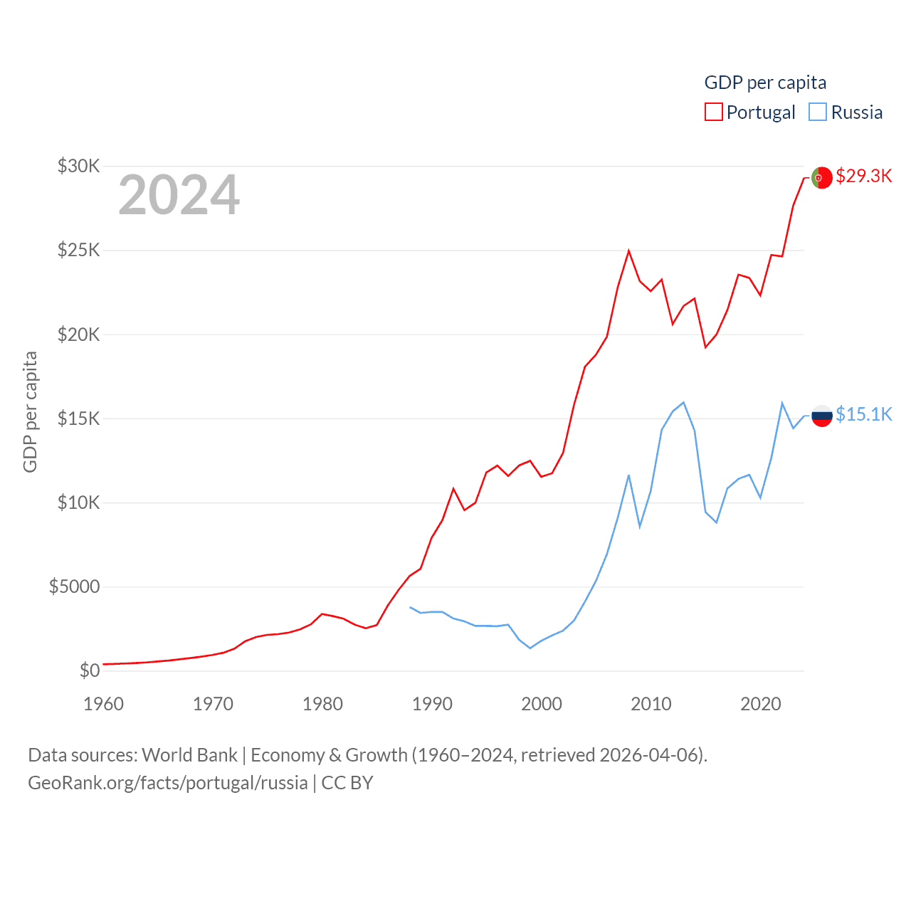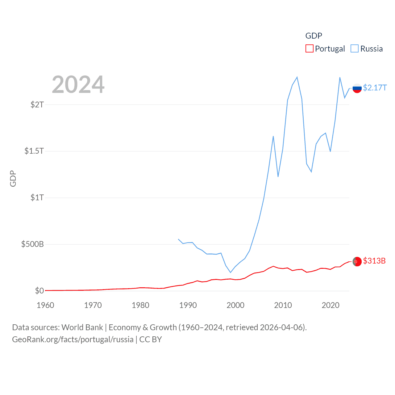 By GDP, Portugal ranks 46/197 ($313B) and Russia ranks 11/197 ($2.17T). By GDP per capita, Portugal ranks 44/197 ($29,292), while Russia ranks 68/197 ($15,145).