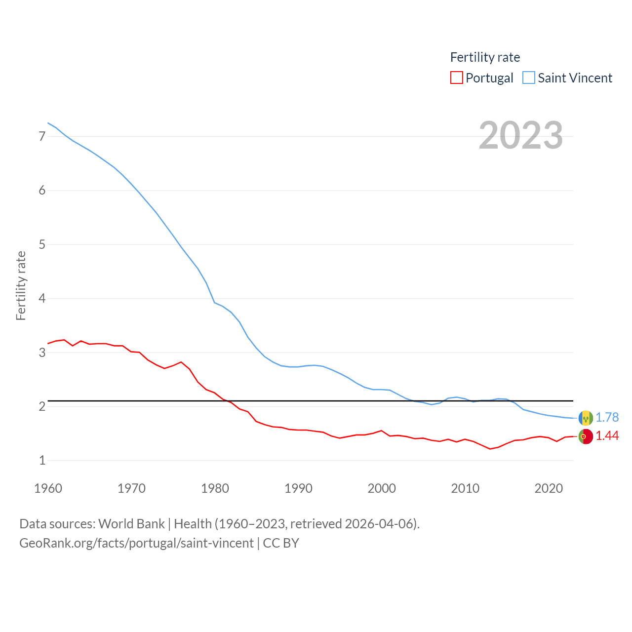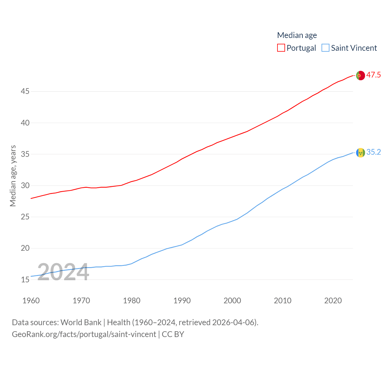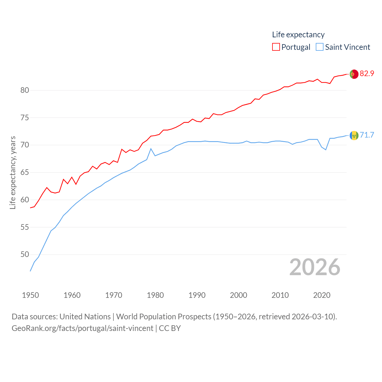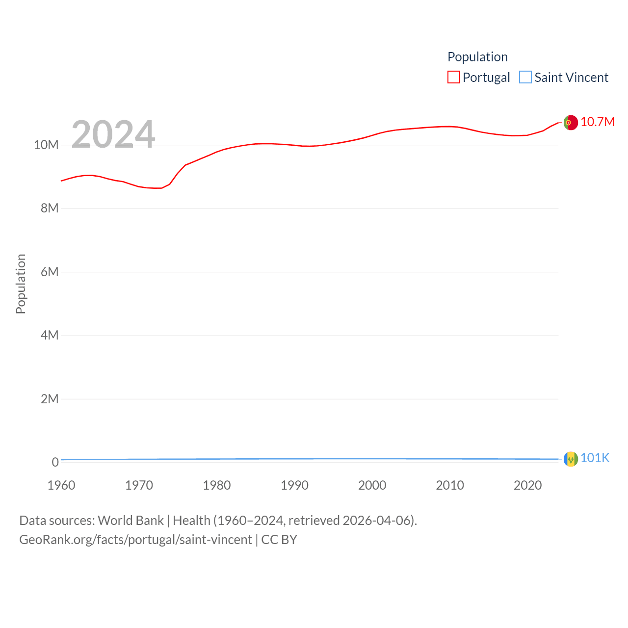 Portugal has a population of 10.7M (ranked 90/197), compared with 101K in Saint Vincent (ranked 184/197). Portugal's land area is 35,369 sq mi versus 150.6 sq mi for Saint Vincent (ranked 108th vs. 185th).