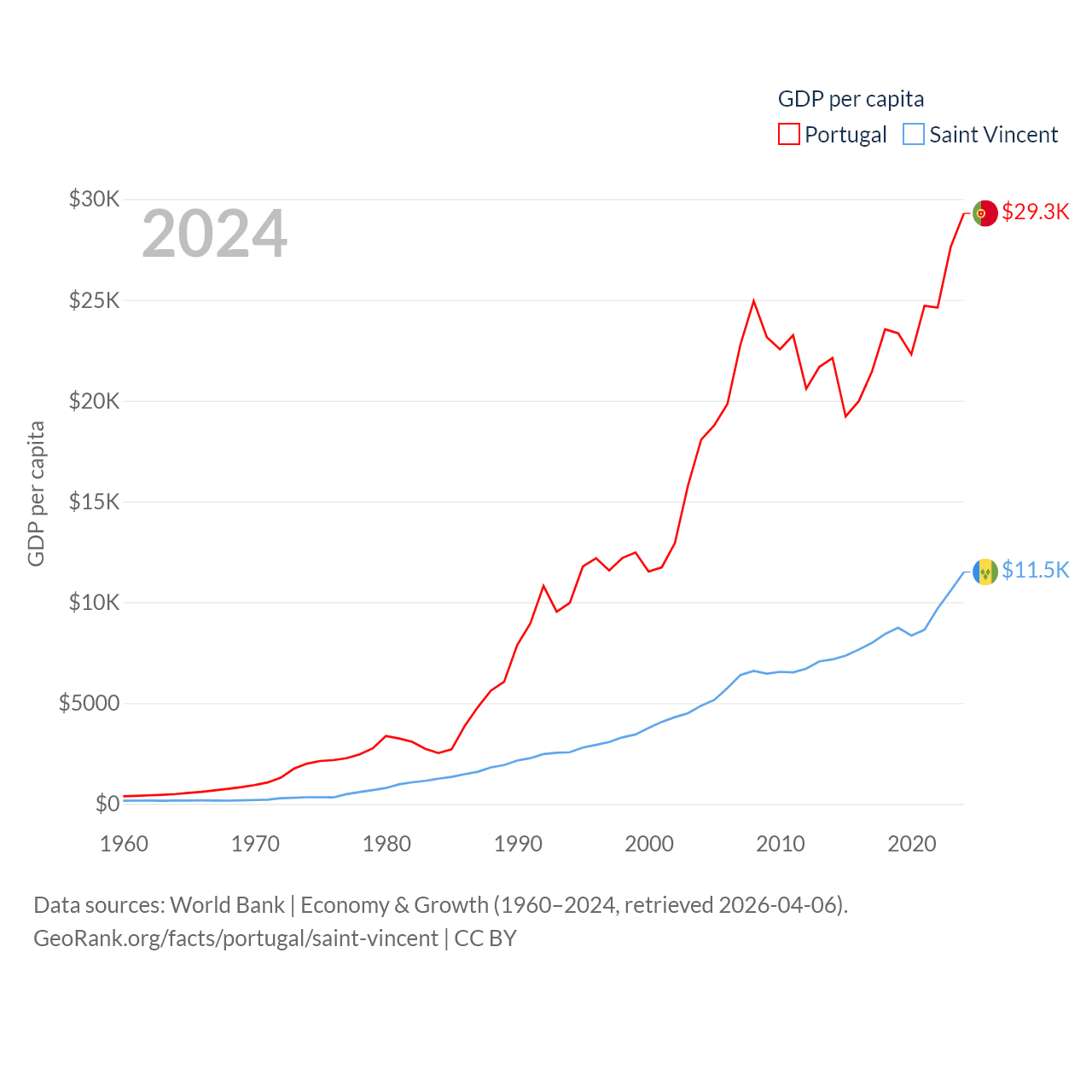 By GDP, Portugal ranks 46/197 ($313B) and Saint Vincent ranks 186/197 ($1.16B). By GDP per capita, Portugal ranks 44/197 ($29,292), while Saint Vincent ranks 81/197 ($11,501).
