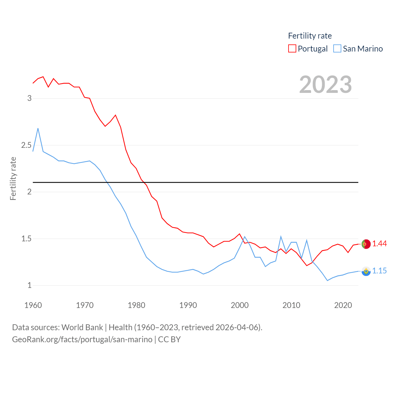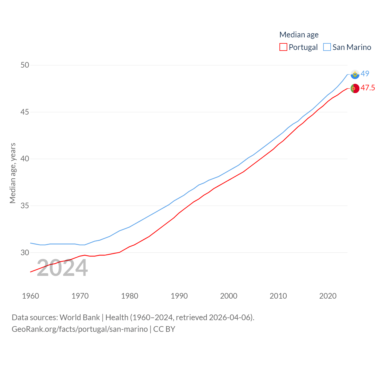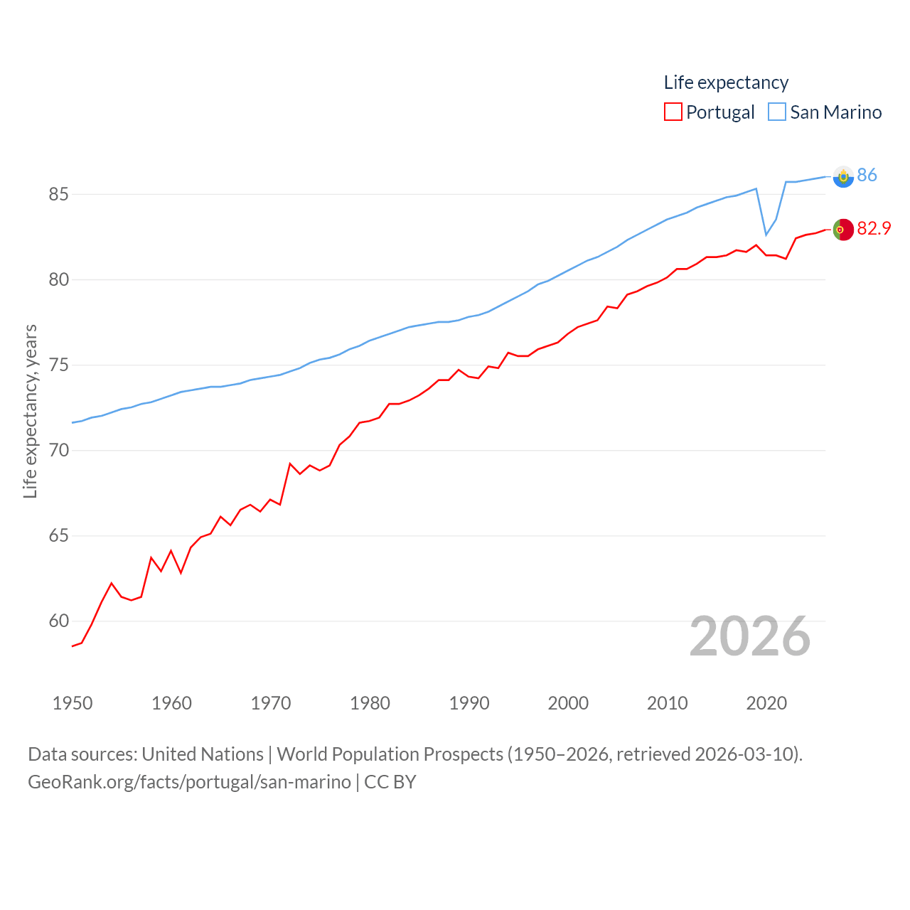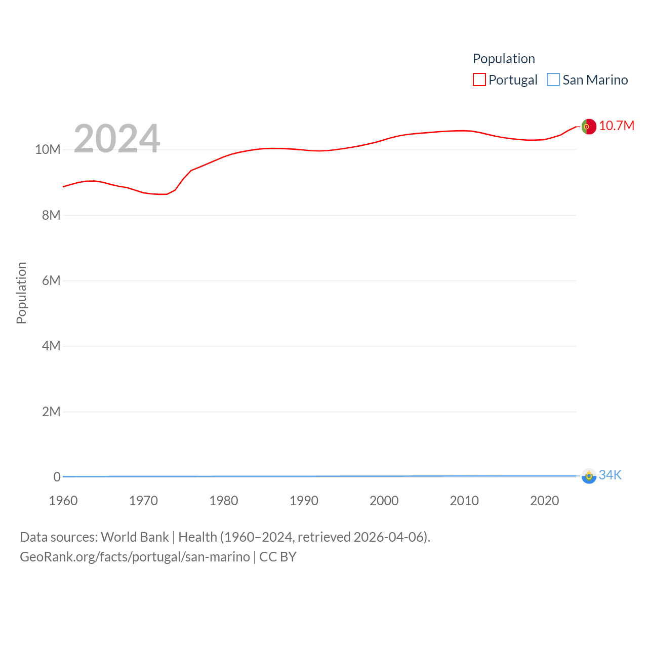 Portugal has a population of 10.7M (ranked 90/197), compared with 34K in San Marino (ranked 193/197). Portugal's land area is 35,369 sq mi versus 23.2 sq mi for San Marino (ranked 108th vs. 193rd).