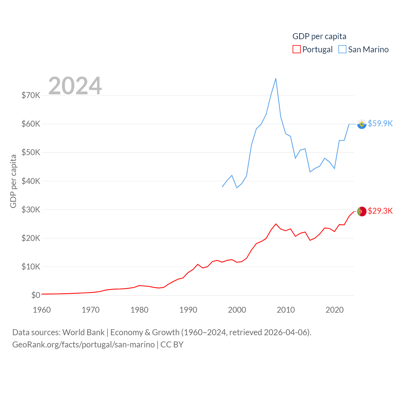 By GDP, Portugal ranks 46/197 ($313B) and San Marino ranks 180/197 ($2.03B). By GDP per capita, Portugal ranks 44/197 ($29,292), while San Marino ranks 15/197 ($59,880).