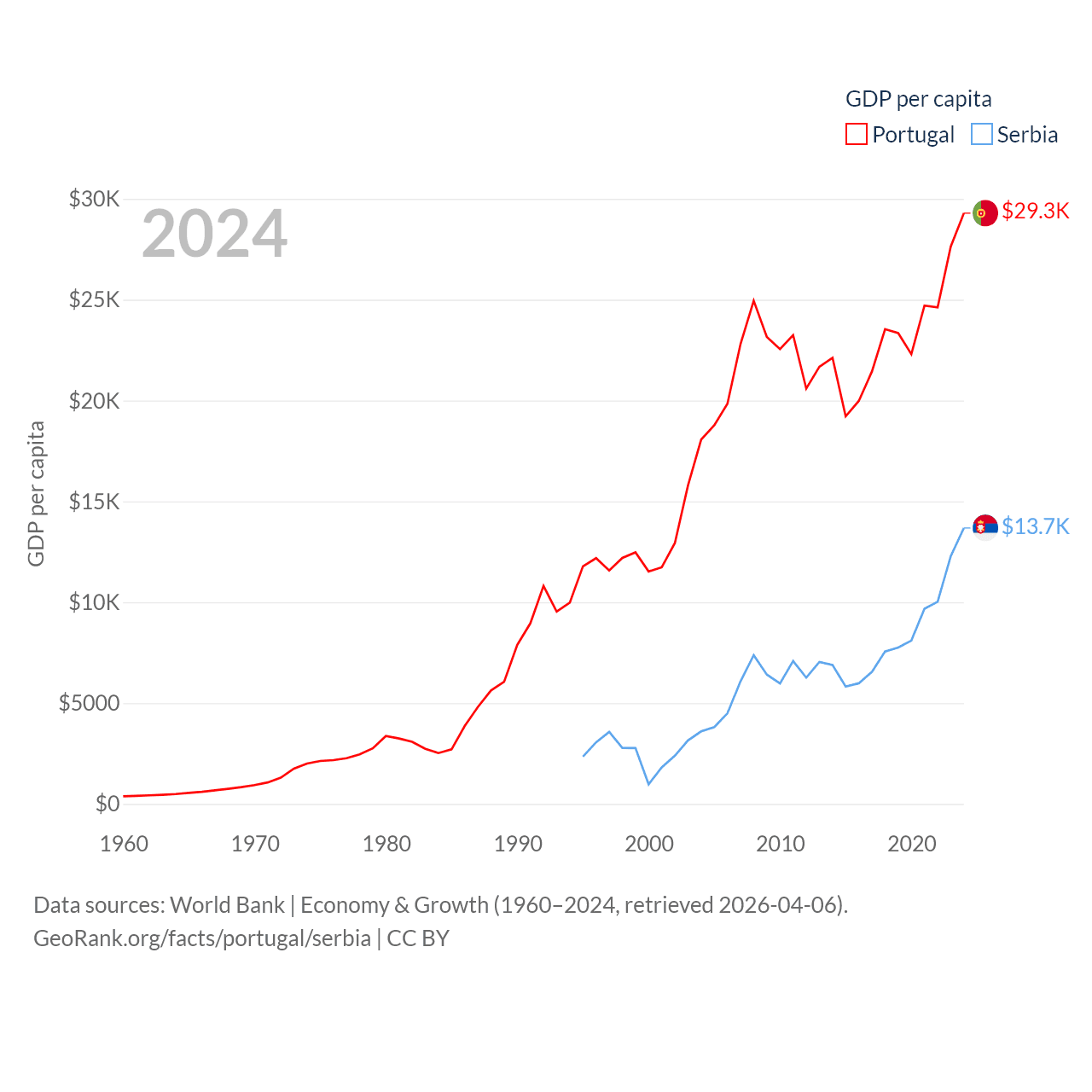 By GDP, Portugal ranks 46/197 ($313B) and Serbia ranks 76/197 ($90.1B). By GDP per capita, Portugal ranks 44/197 ($29,292), while Serbia ranks 73/197 ($13,679).