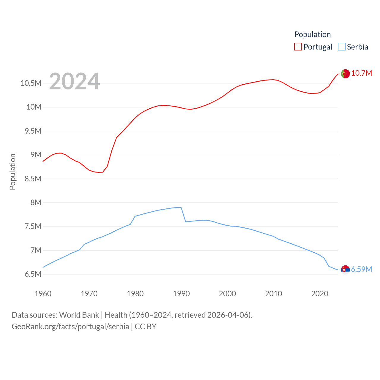 Portugal has a population of 10.7M (ranked 90/197), compared with 6.59M in Serbia (ranked 109/197). Portugal's land area is 35,369 sq mi versus 32,467 sq mi for Serbia (ranked 108th vs. 111th).