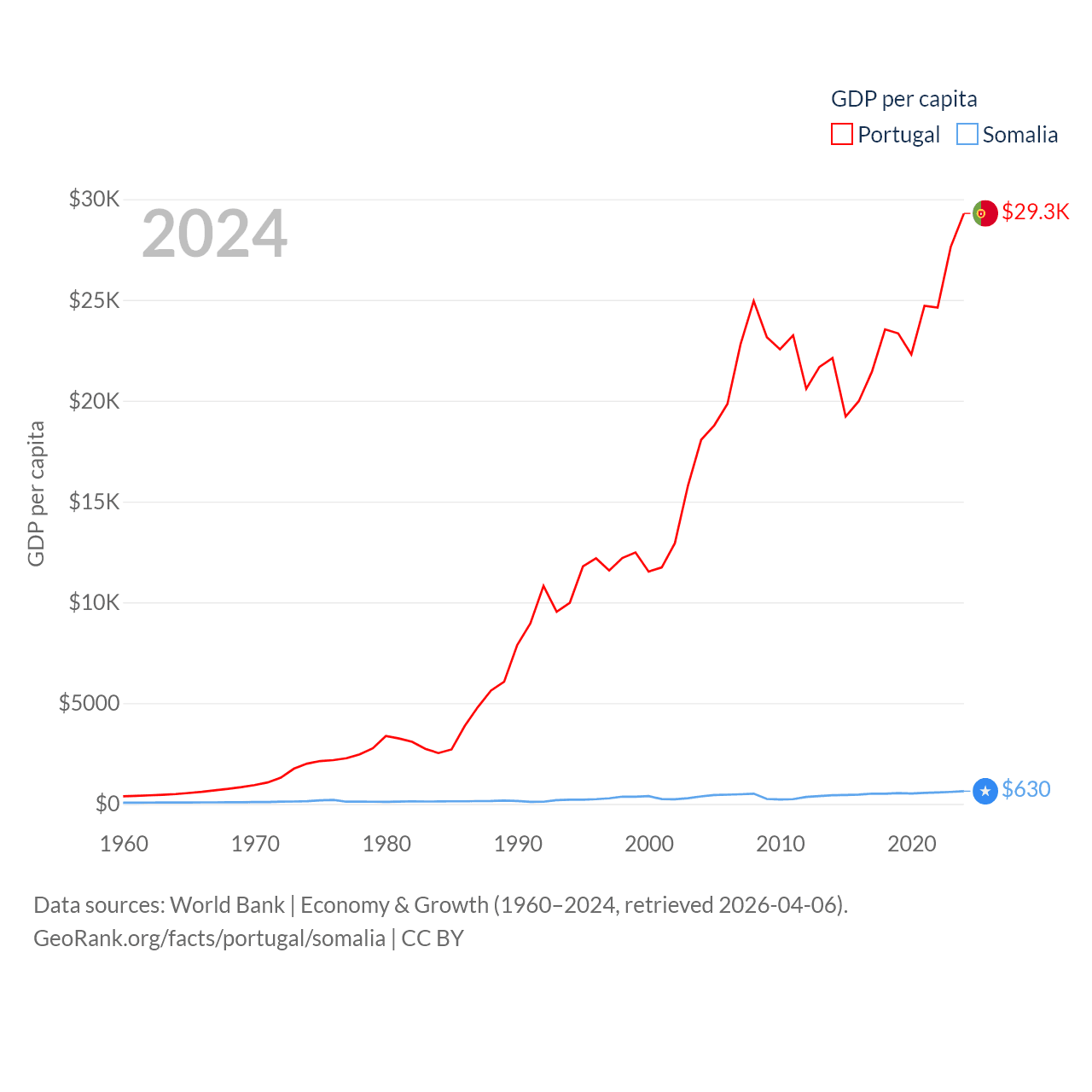 By GDP, Portugal ranks 46/197 ($313B) and Somalia ranks 150/197 ($12B). By GDP per capita, Portugal ranks 44/197 ($29,292), while Somalia ranks 192/197 ($630).