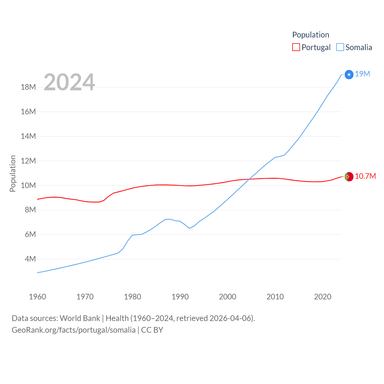 Portugal has a population of 10.7M (ranked 90/197), compared with 19M in Somalia (ranked 68/197). Portugal's land area is 35,369 sq mi versus 242,217 sq mi for Somalia (ranked 108th vs. 42nd).