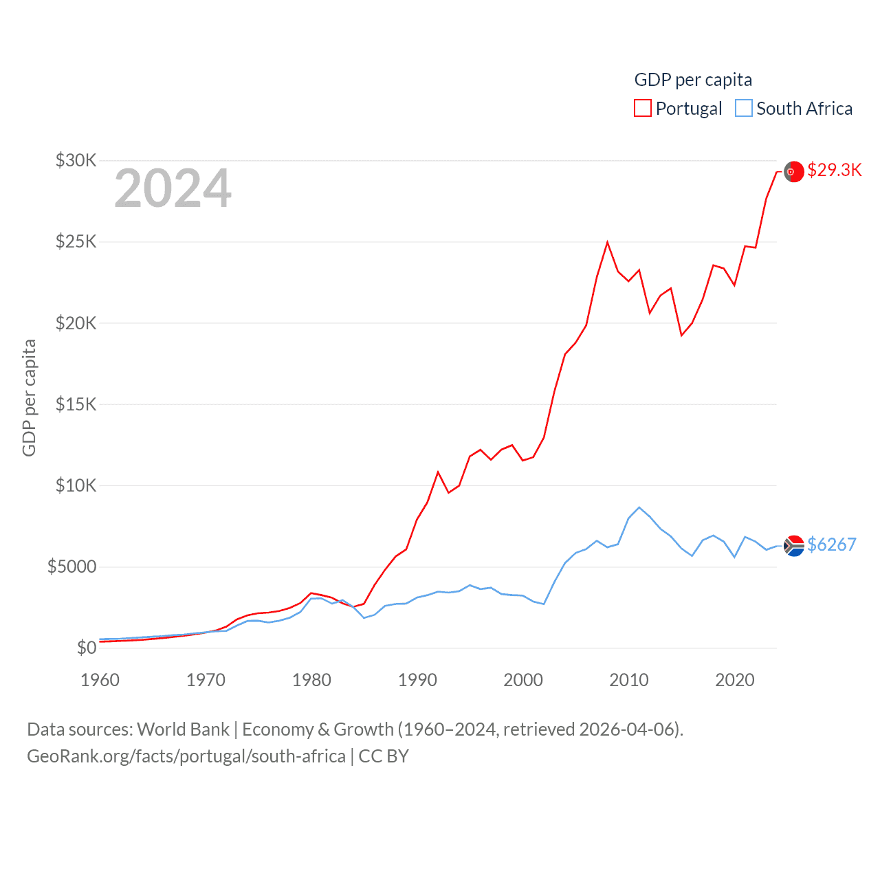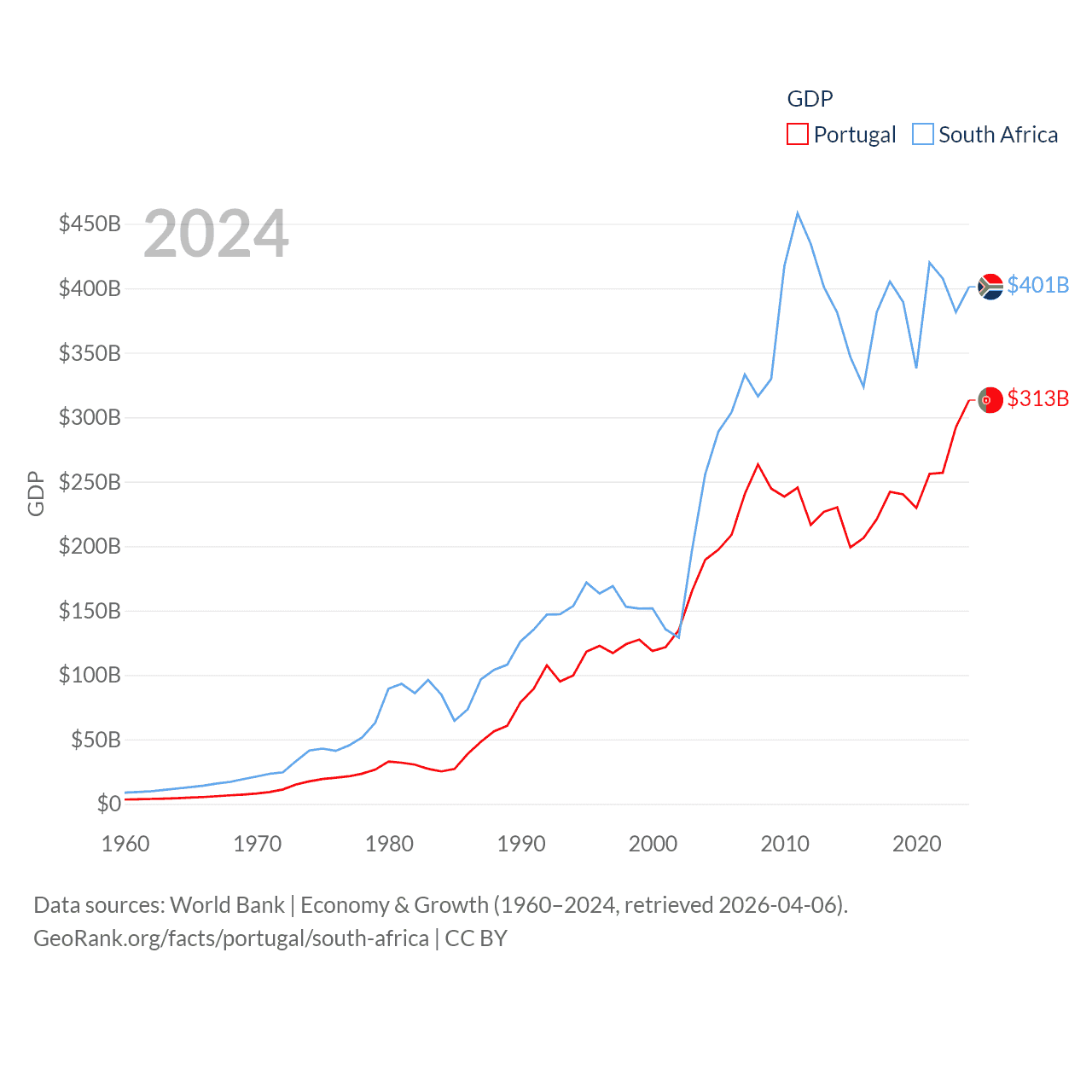 By GDP, Portugal ranks 46/197 ($313B) and South Africa ranks 40/197 ($401B). By GDP per capita, Portugal ranks 44/197 ($29,292), while South Africa ranks 111/197 ($6,267).