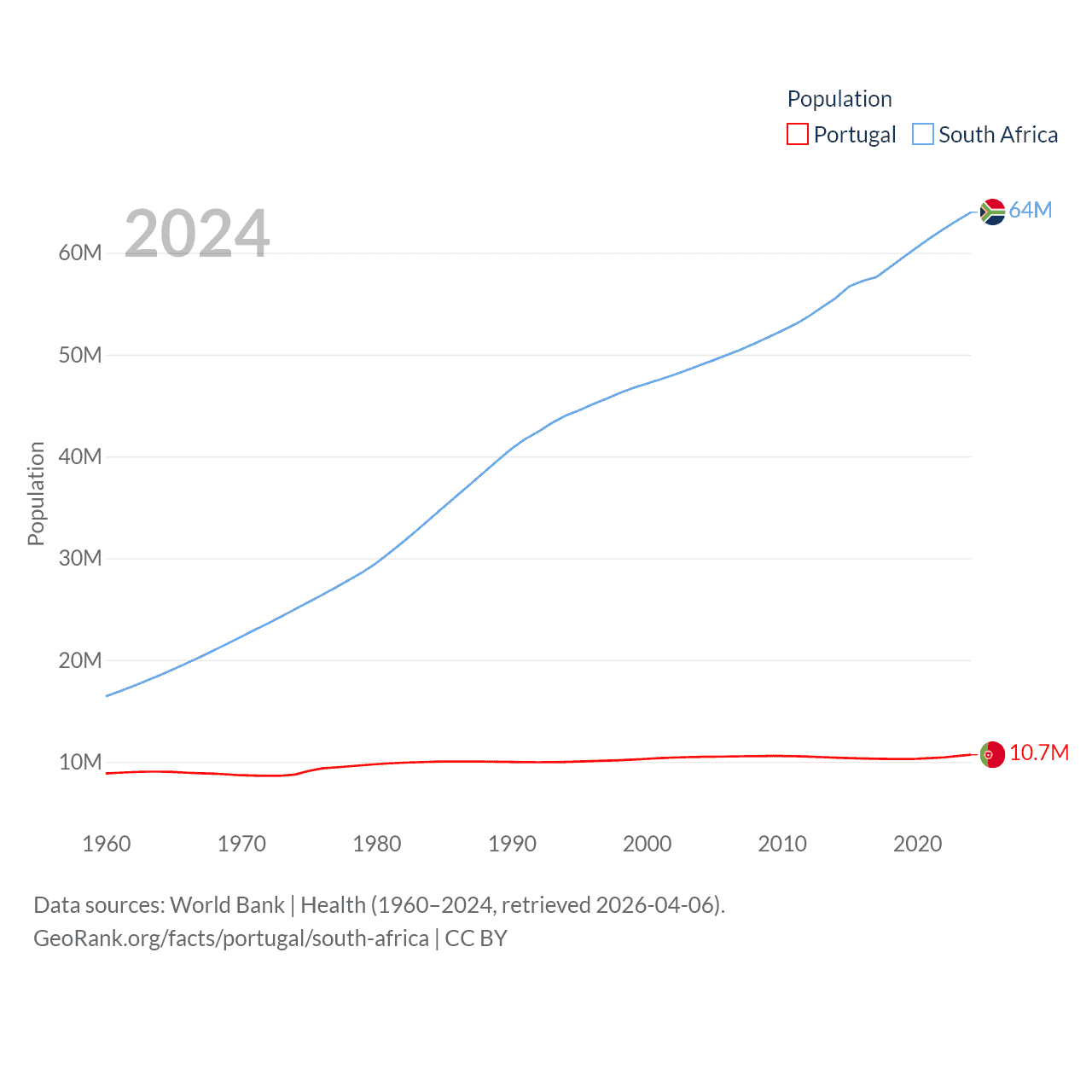 Portugal has a population of 10.7M (ranked 90/197), compared with 64M in South Africa (ranked 24/197). Portugal's land area is 35,369 sq mi versus 468,377 sq mi for South Africa (ranked 108th vs. 24th).