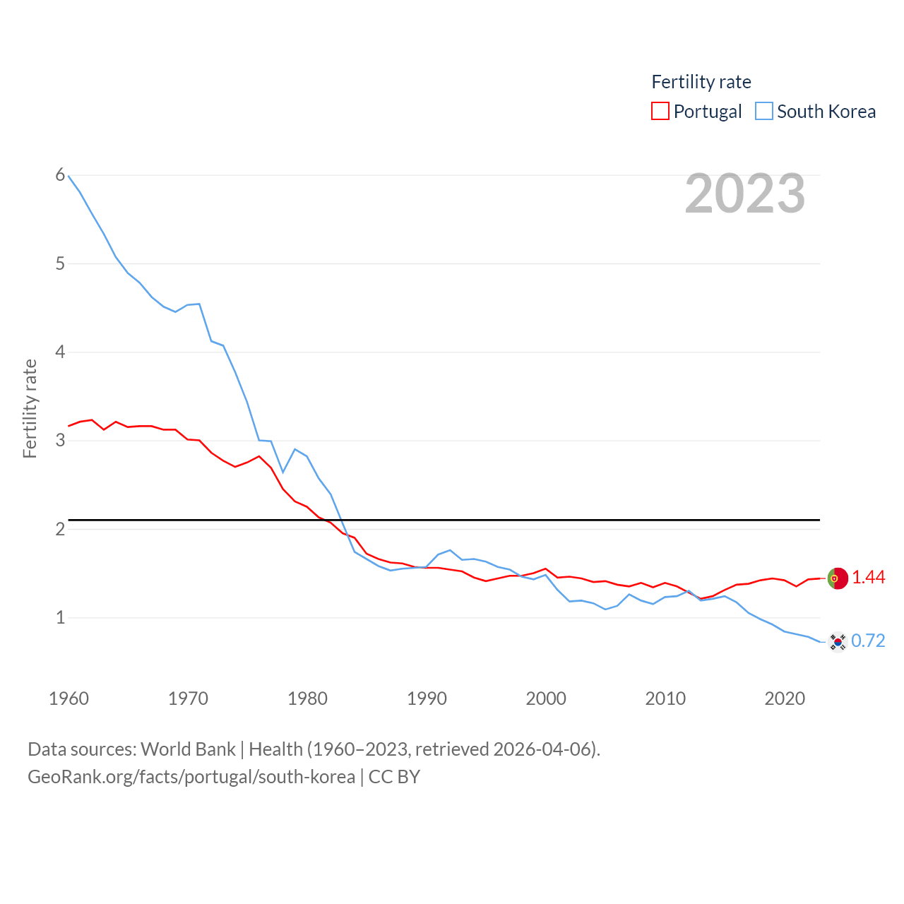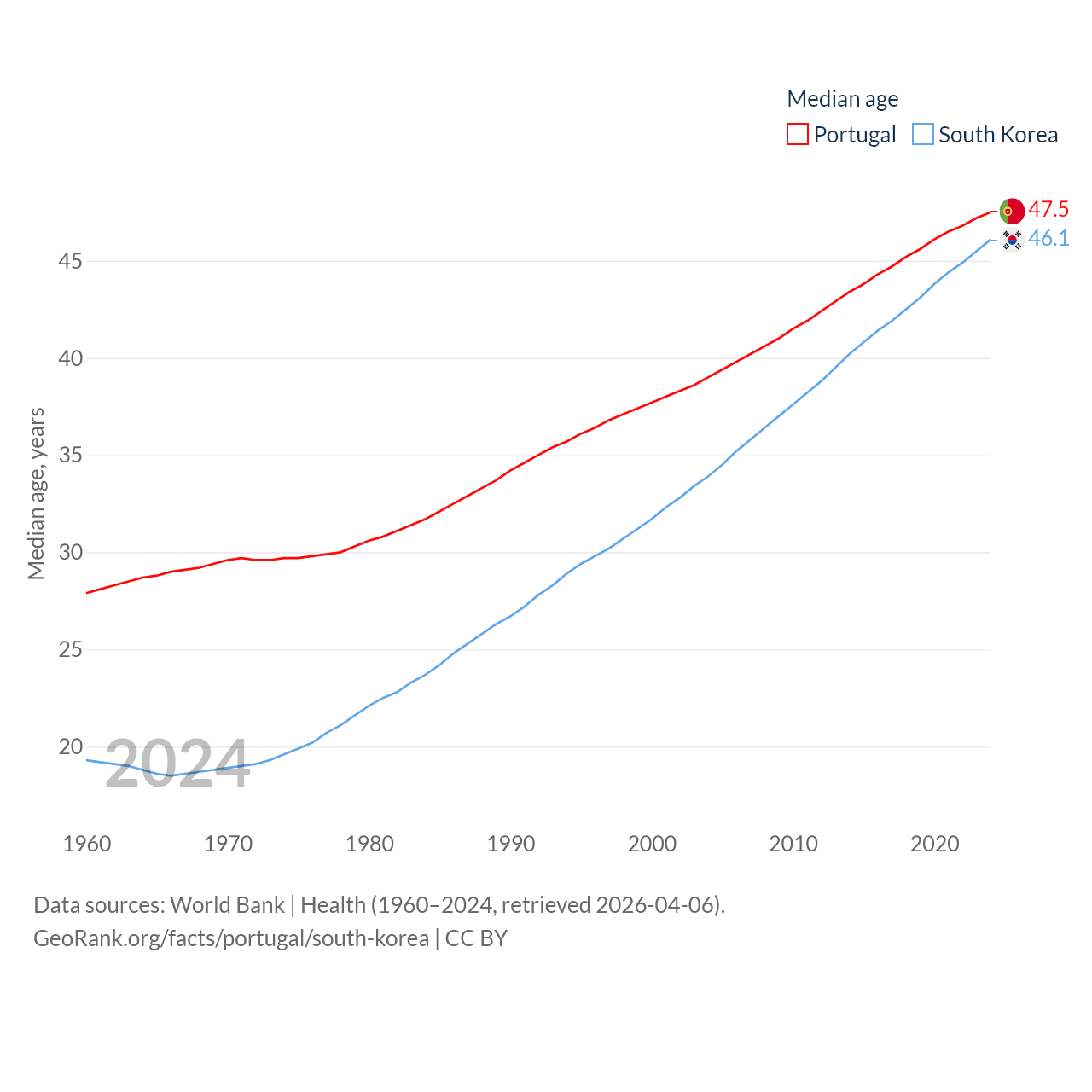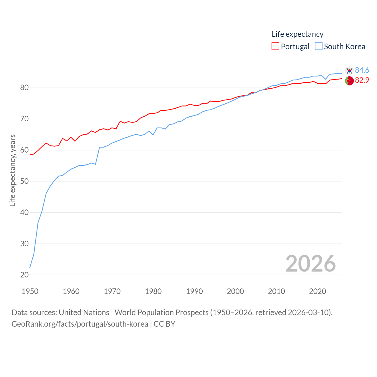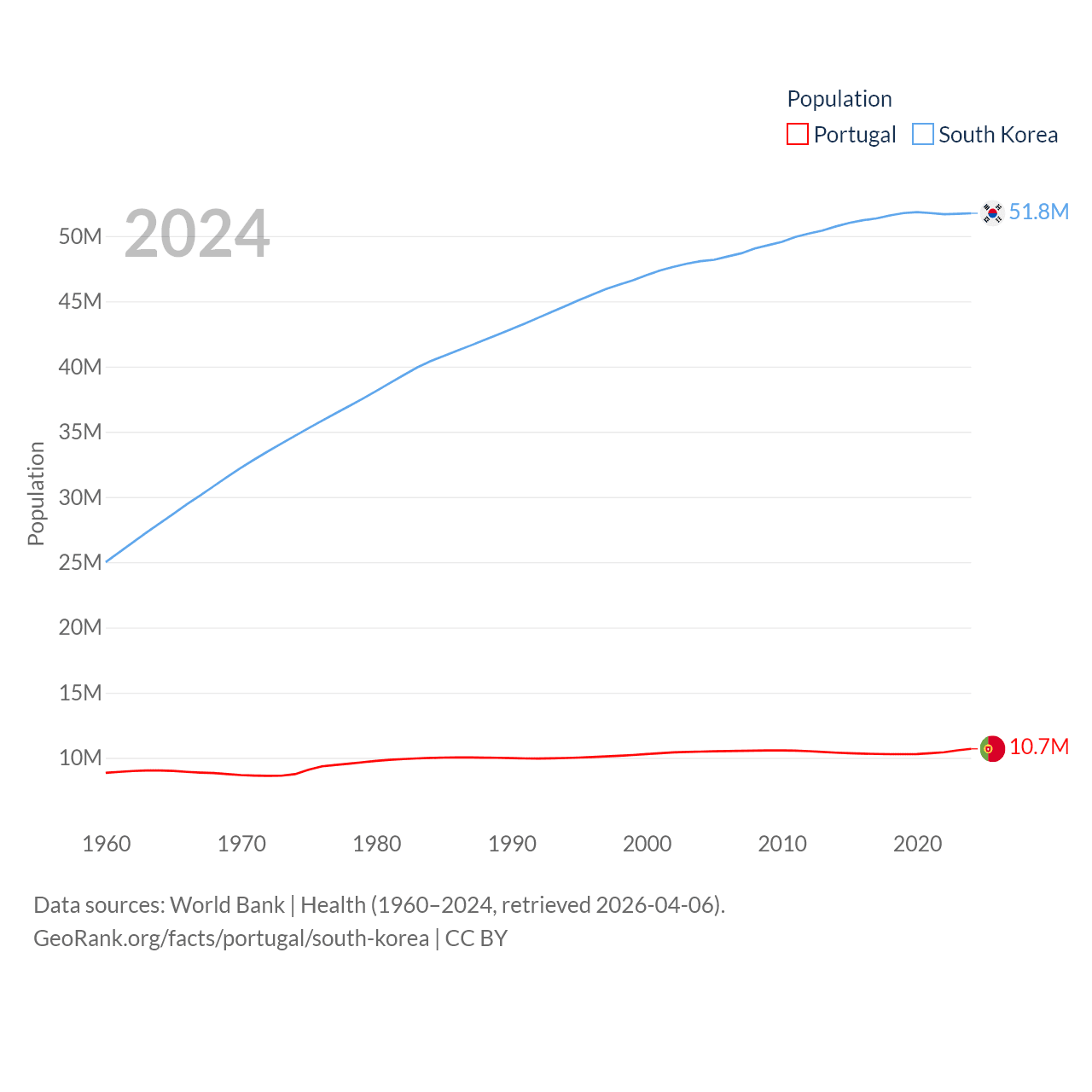 Portugal has a population of 10.7M (ranked 90/197), compared with 51.8M in South Korea (ranked 29/197). Portugal's land area is 35,369 sq mi versus 37,684 sq mi for South Korea (ranked 108th vs. 105th).