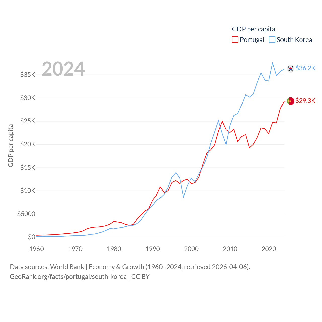 By GDP, Portugal ranks 46/197 ($313B) and South Korea ranks 12/197 ($1.88T). By GDP per capita, Portugal ranks 44/197 ($29,292), while South Korea ranks 31/197 ($36,239).