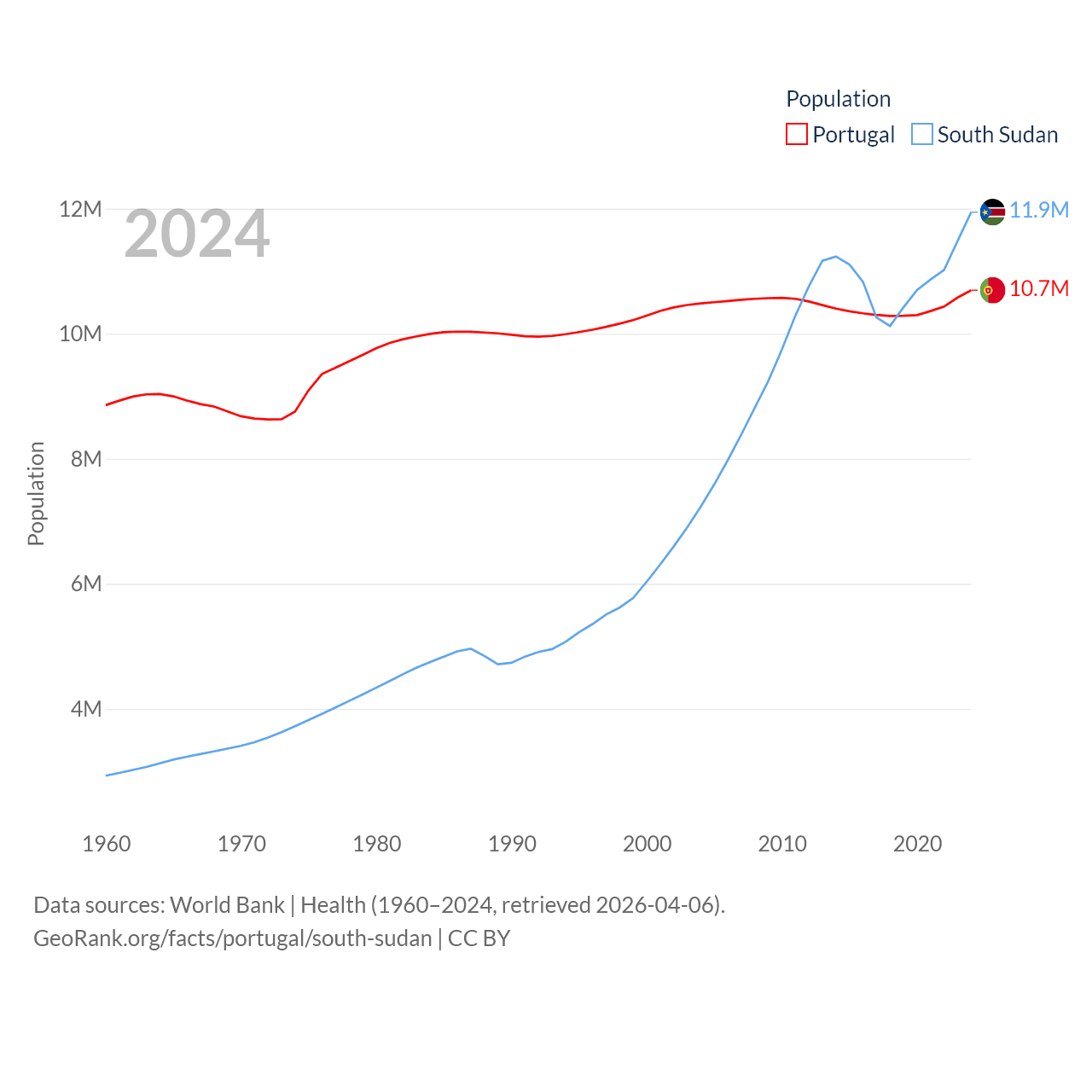 Portugal has a population of 10.7M (ranked 90/197), compared with 11.9M in South Sudan (ranked 81/197). Portugal's land area is 35,369 sq mi versus 243,990 sq mi for South Sudan (ranked 108th vs. 41st).