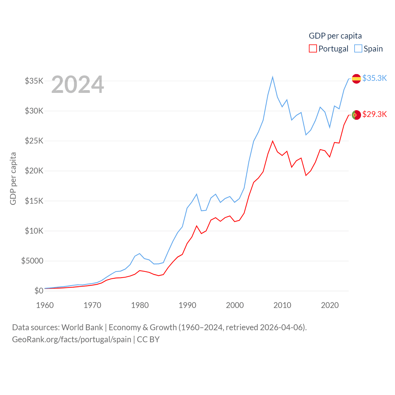 By GDP, Portugal ranks 46/197 ($313B) and Spain ranks 15/197 ($1.73T). By GDP per capita, Portugal ranks 44/197 ($29,292), while Spain ranks 32/197 ($35,327).