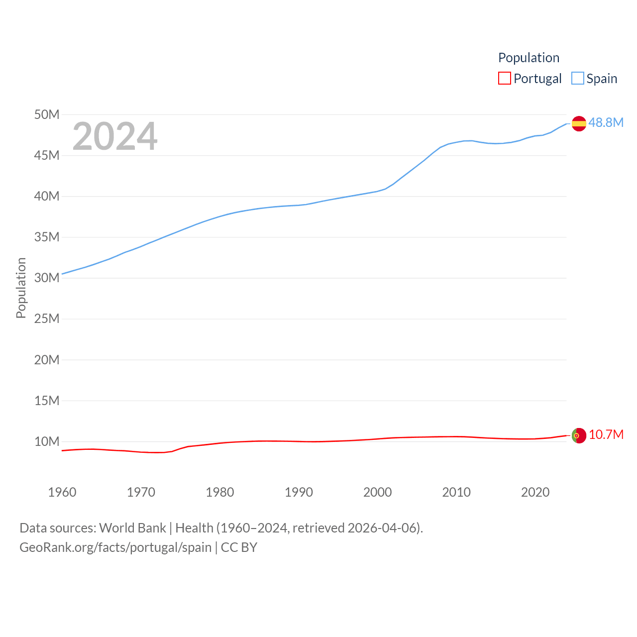 Portugal has a population of 10.7M (ranked 90/197), compared with 48.8M in Spain (ranked 32/197). Portugal's land area is 35,369 sq mi versus 192,934 sq mi for Spain (ranked 108th vs. 51st).