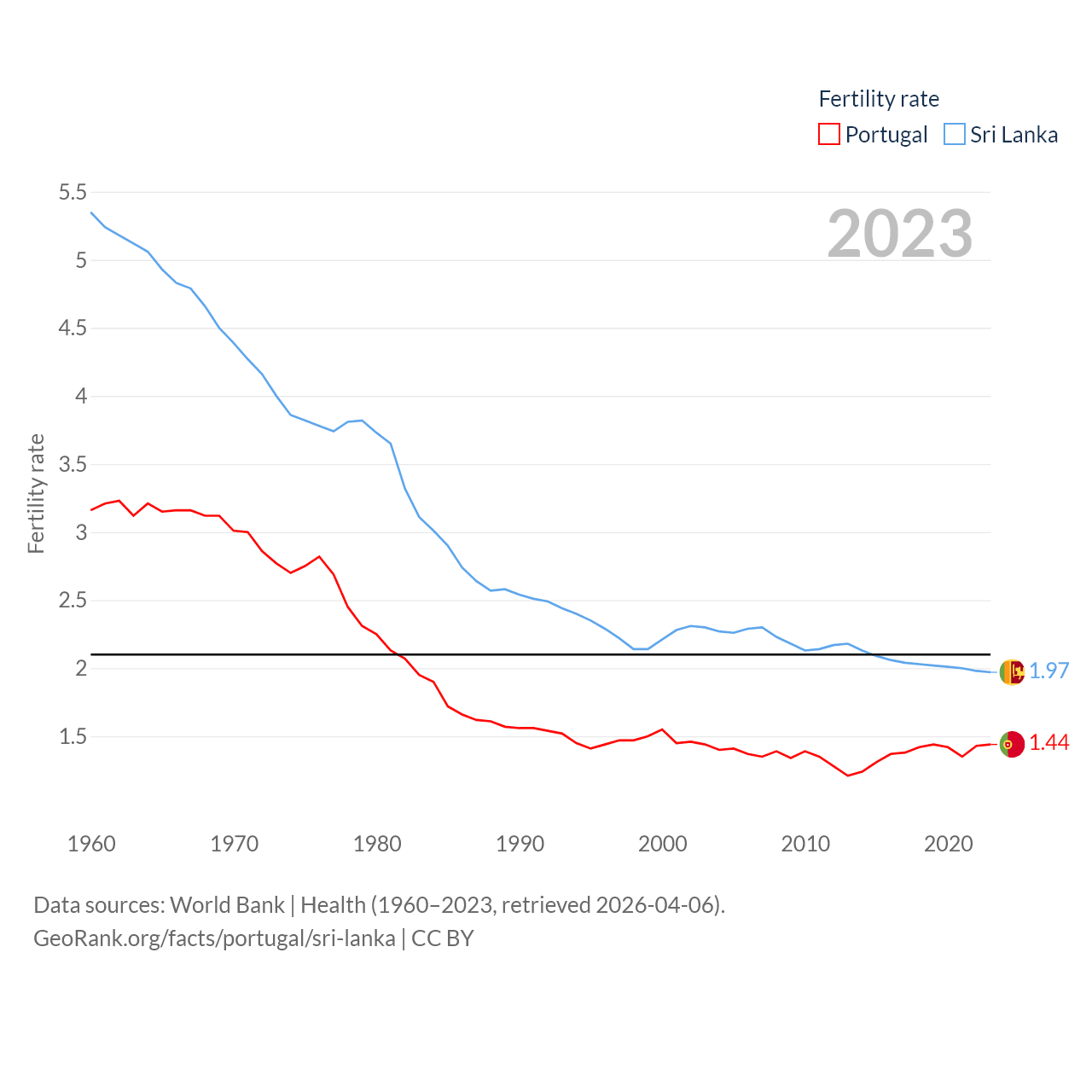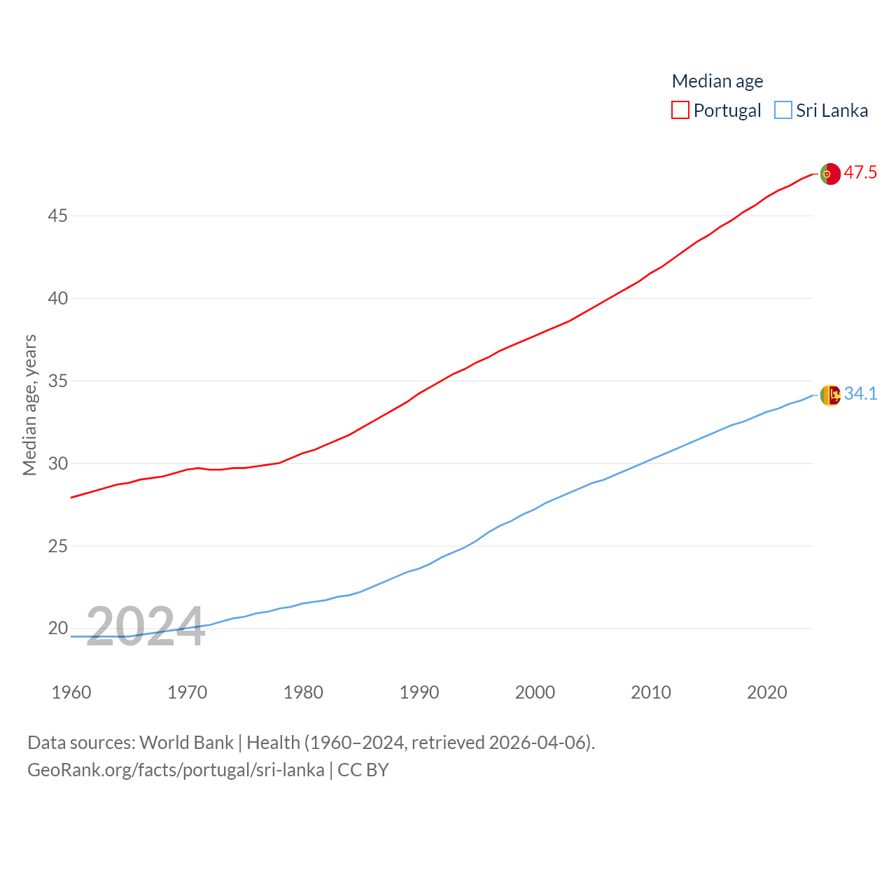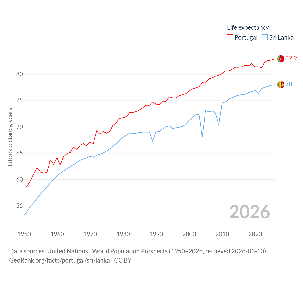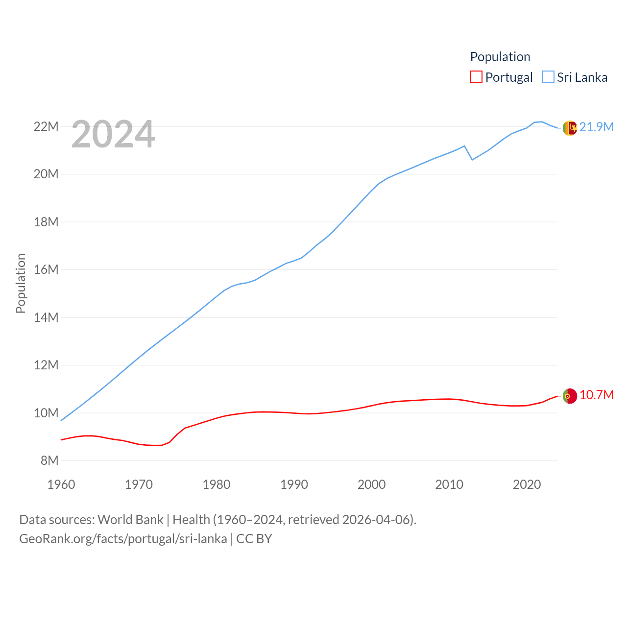 Portugal has a population of 10.7M (ranked 90/197), compared with 21.9M in Sri Lanka (ranked 61/197). Portugal's land area is 35,369 sq mi versus 23,884 sq mi for Sri Lanka (ranked 108th vs. 122nd).