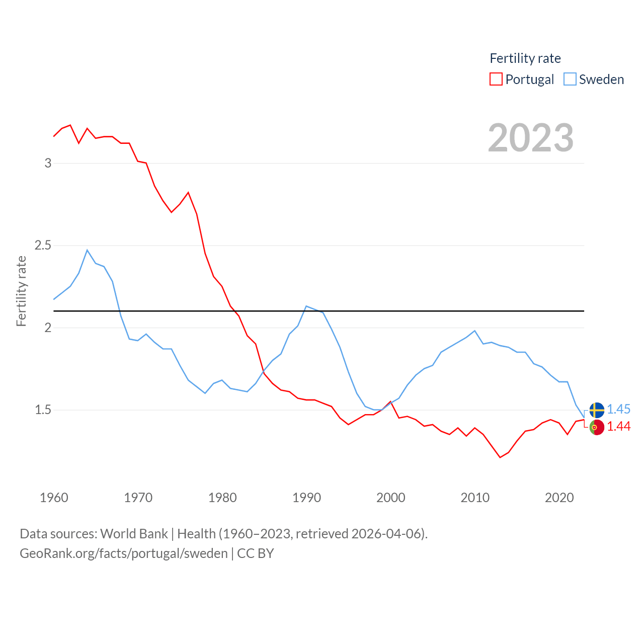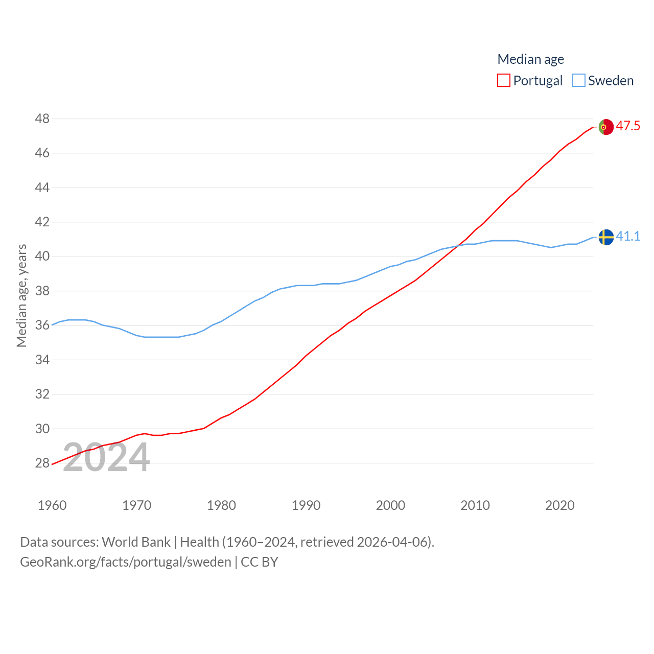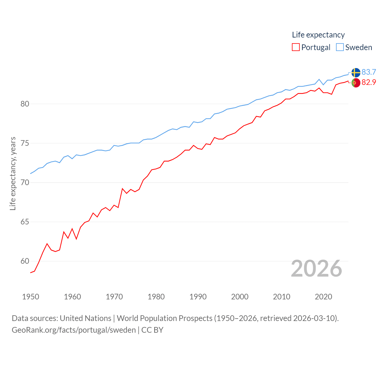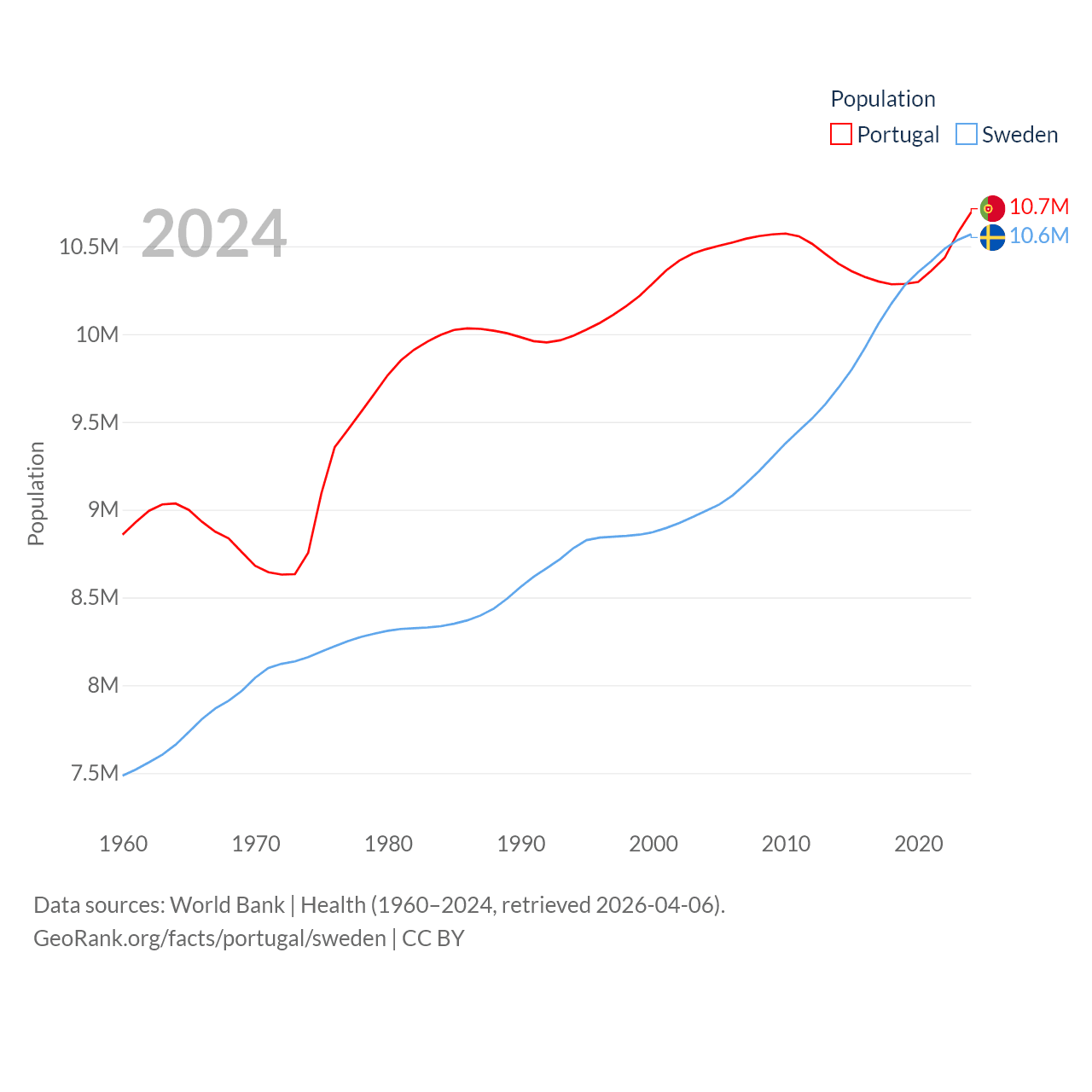Portugal has a population of 10.7M (ranked 90/197), compared with 10.6M in Sweden (ranked 93/197). Portugal's land area is 35,369 sq mi versus 157,248 sq mi for Sweden (ranked 108th vs. 58th).