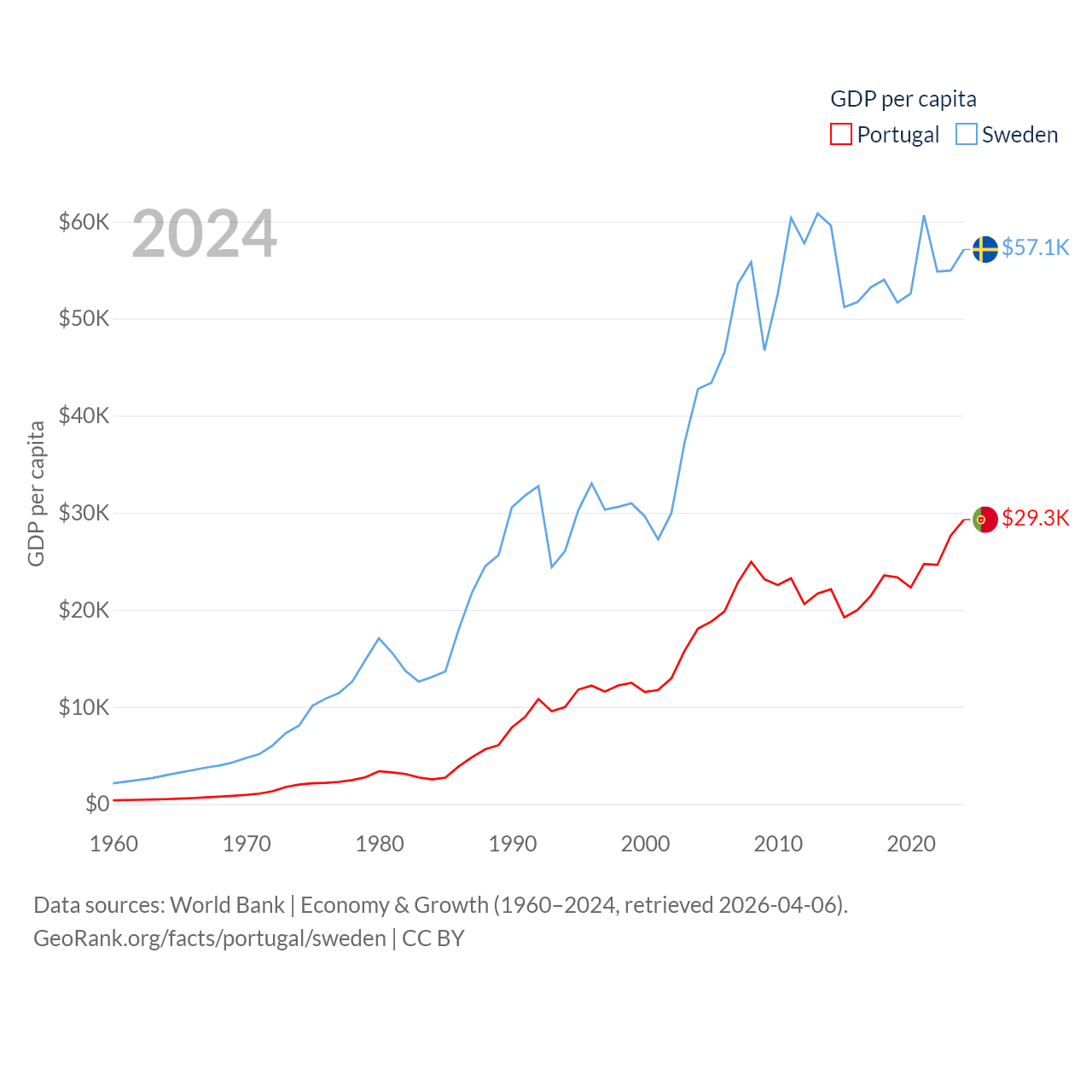By GDP, Portugal ranks 46/197 ($313B) and Sweden ranks 26/197 ($604B). By GDP per capita, Portugal ranks 44/197 ($29,292), while Sweden ranks 17/197 ($57,117).