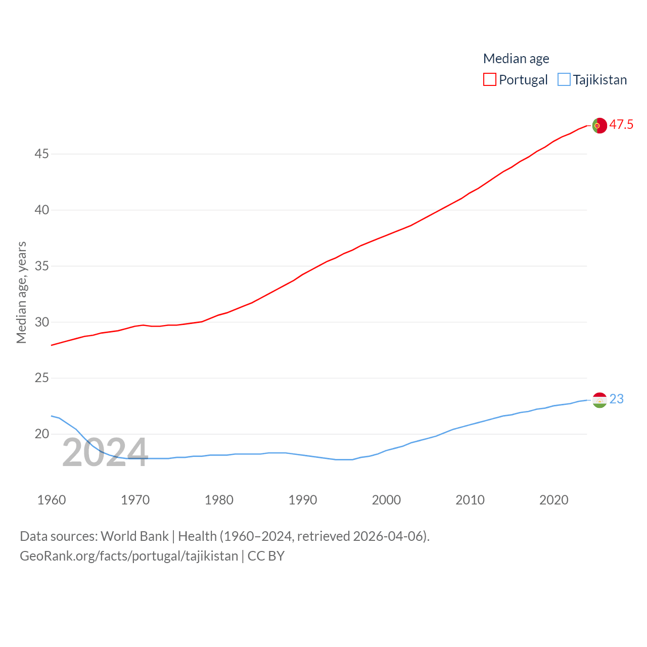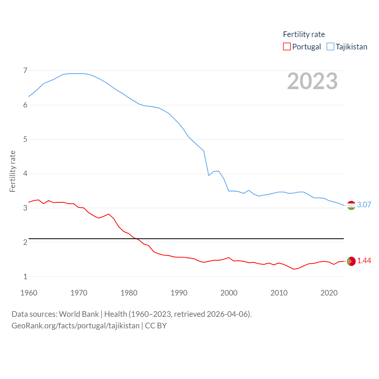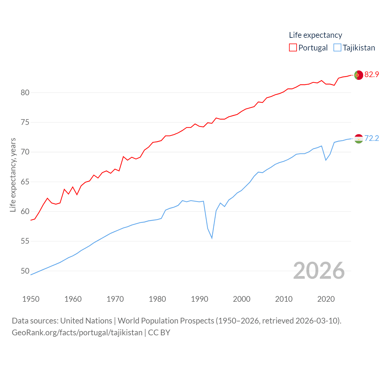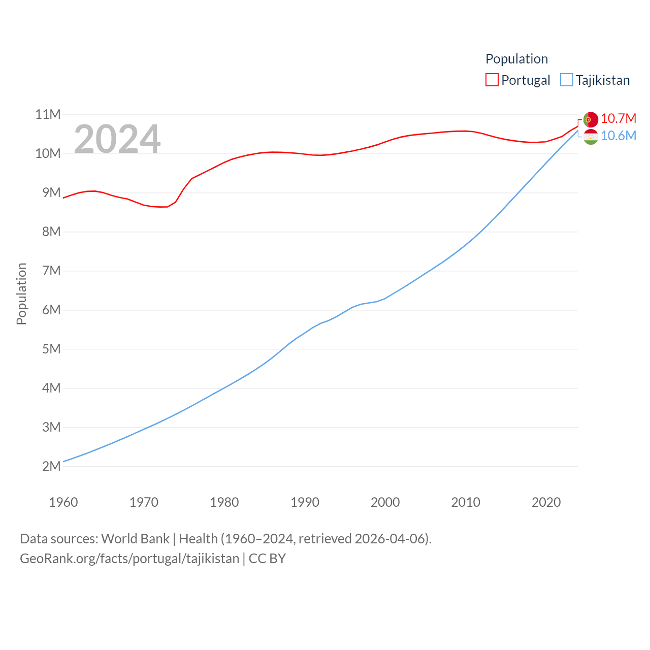 Portugal has a population of 10.7M (ranked 90/197), compared with 10.6M in Tajikistan (ranked 91/197). Portugal's land area is 35,369 sq mi versus 53,587 sq mi for Tajikistan (ranked 108th vs. 93rd).