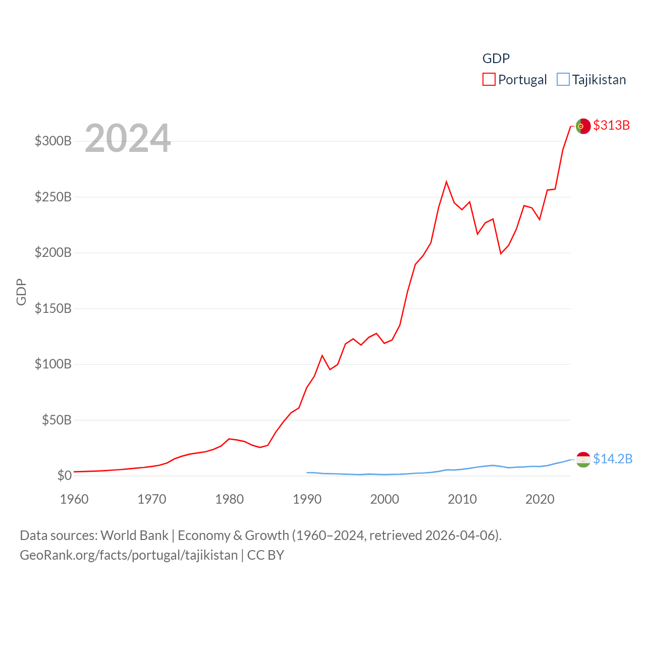 By GDP, Portugal ranks 46/197 ($313B) and Tajikistan ranks 145/197 ($14.2B). By GDP per capita, Portugal ranks 44/197 ($29,292), while Tajikistan ranks 166/197 ($1,341).