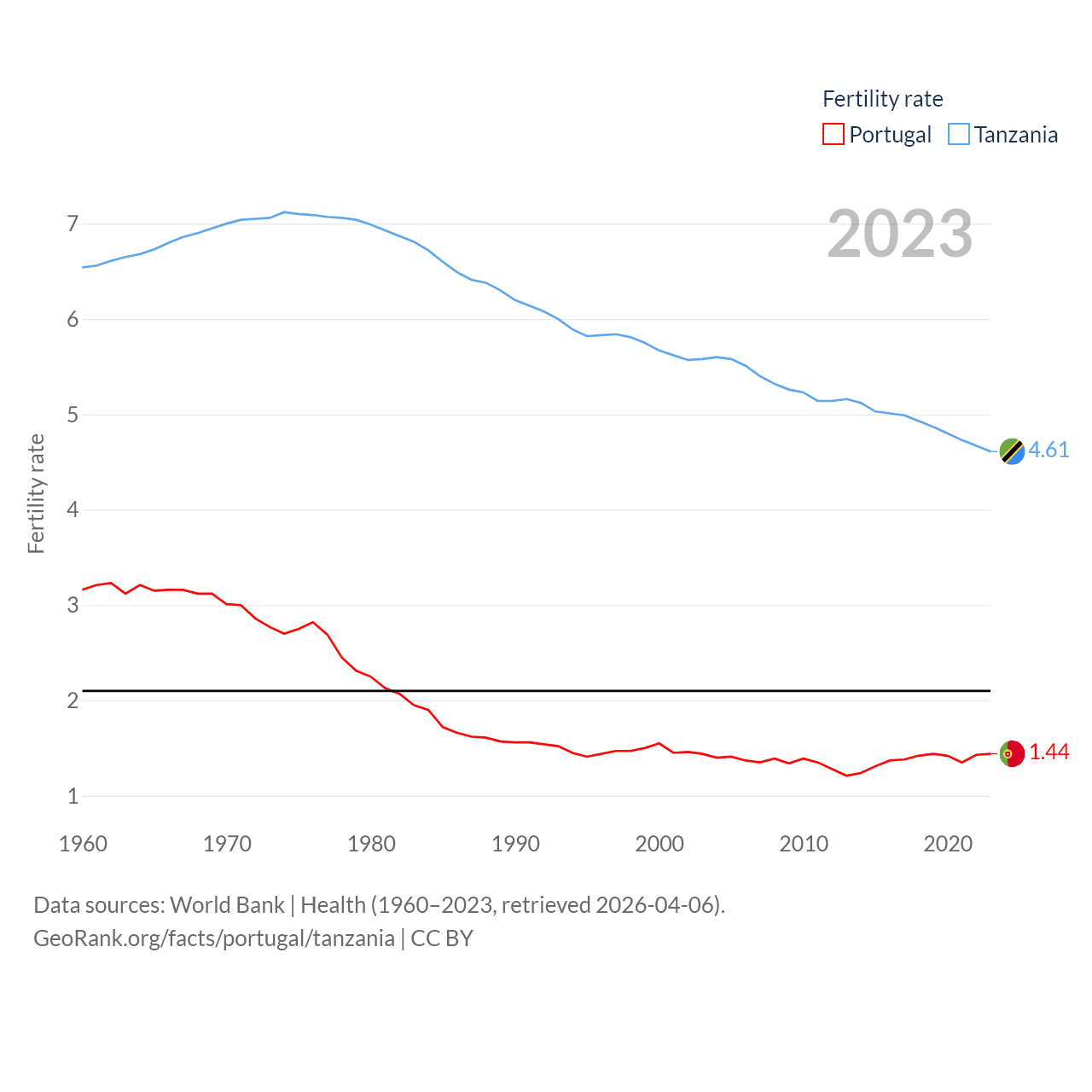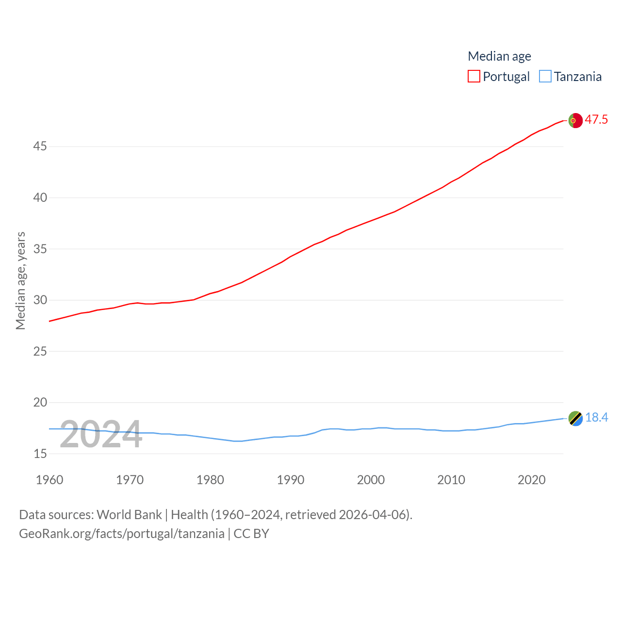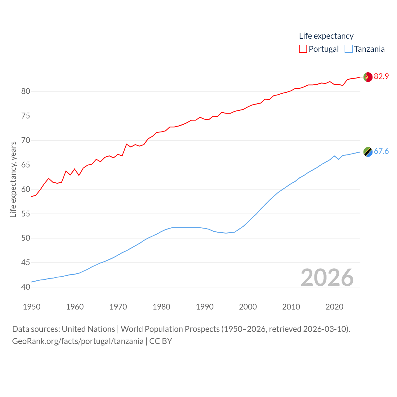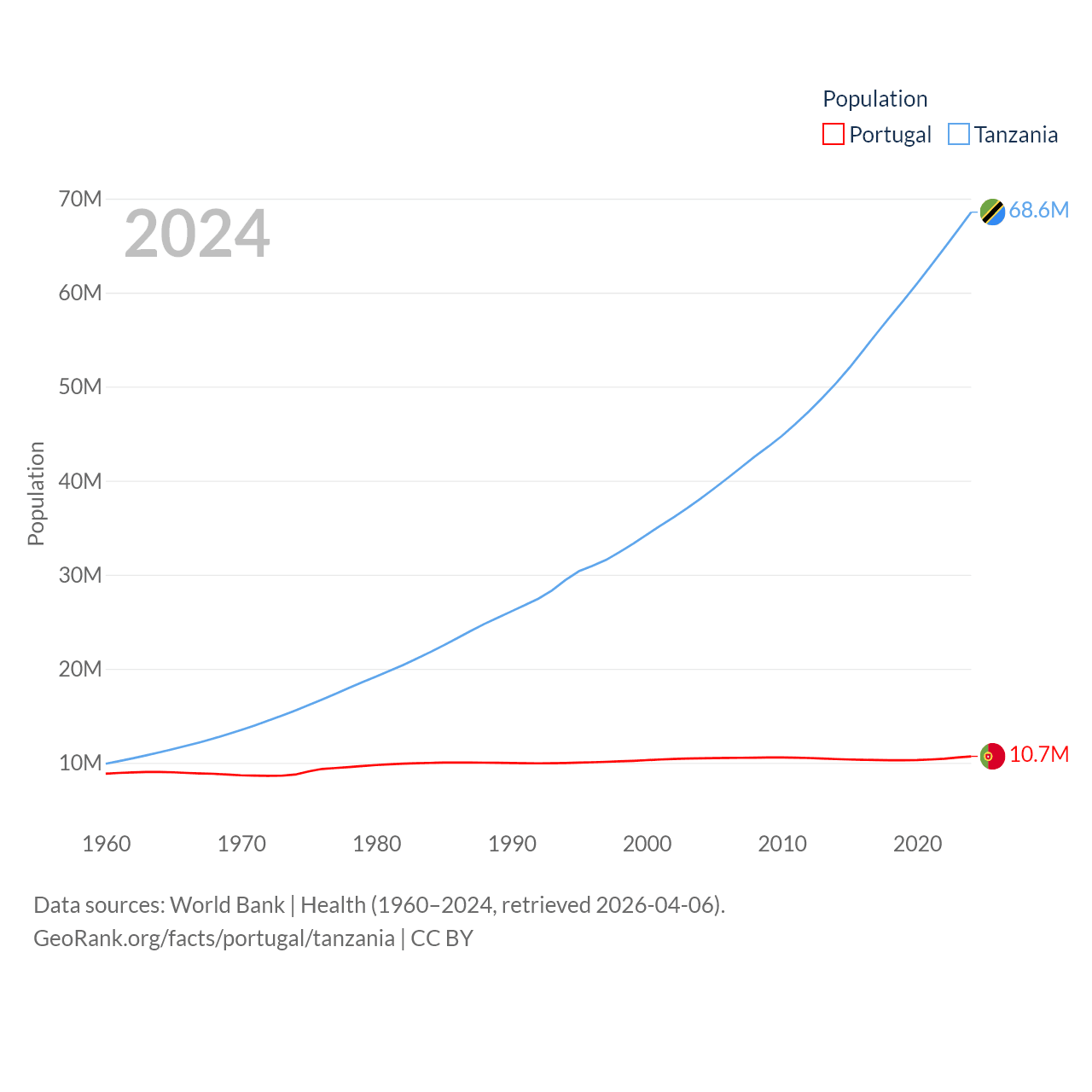 Portugal has a population of 10.7M (ranked 90/197), compared with 68.6M in Tanzania (ranked 22/197). Portugal's land area is 35,369 sq mi versus 342,009 sq mi for Tanzania (ranked 108th vs. 31st).