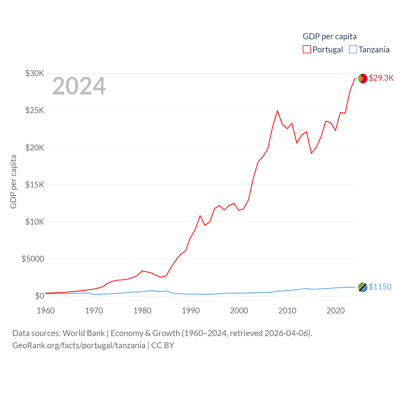 By GDP, Portugal ranks 46/197 ($313B) and Tanzania ranks 82/197 ($78.8B). By GDP per capita, Portugal ranks 44/197 ($29,292), while Tanzania ranks 170/197 ($1,150).