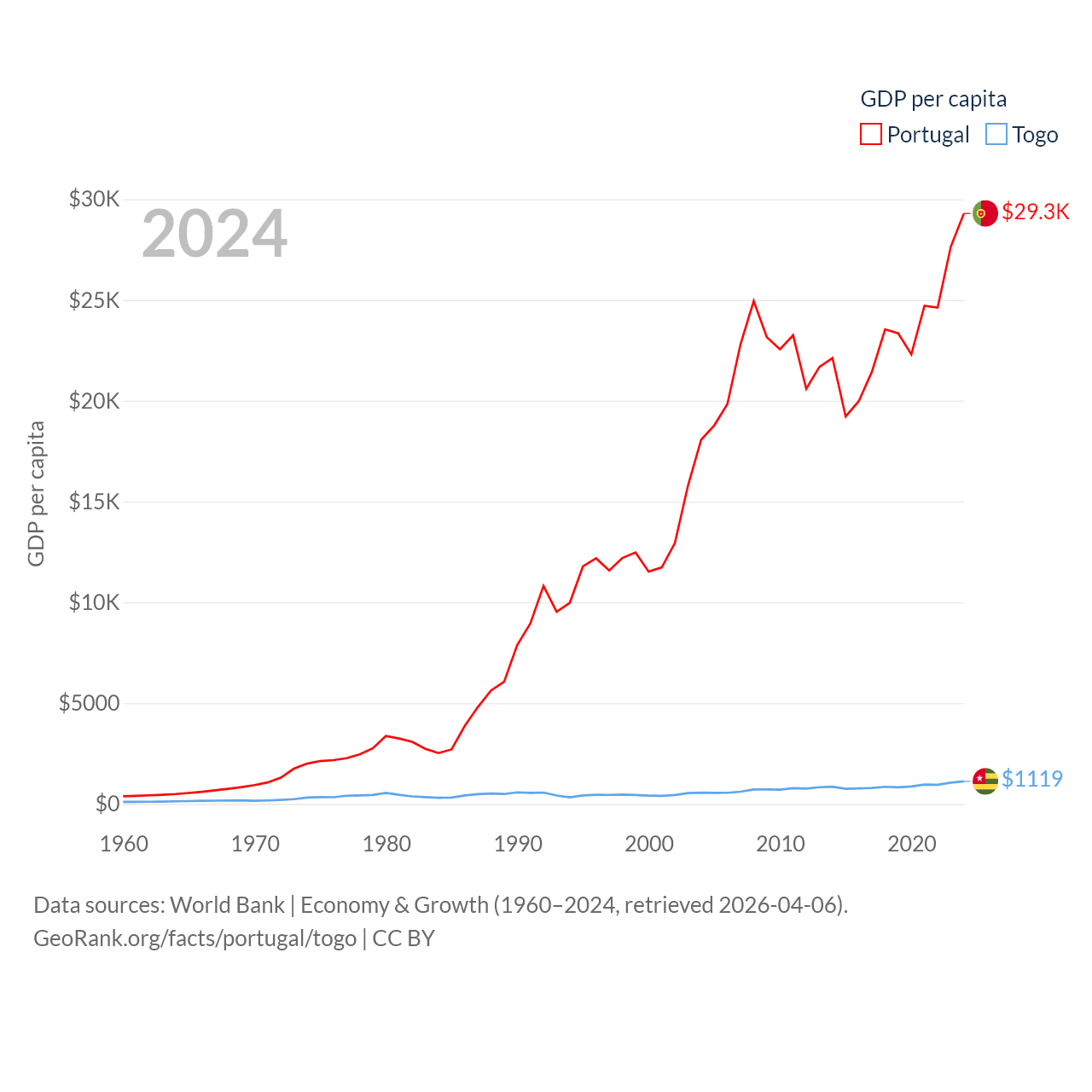 By GDP, Portugal ranks 46/197 ($313B) and Togo ranks 154/197 ($10.7B). By GDP per capita, Portugal ranks 44/197 ($29,292), while Togo ranks 172/197 ($1,119).