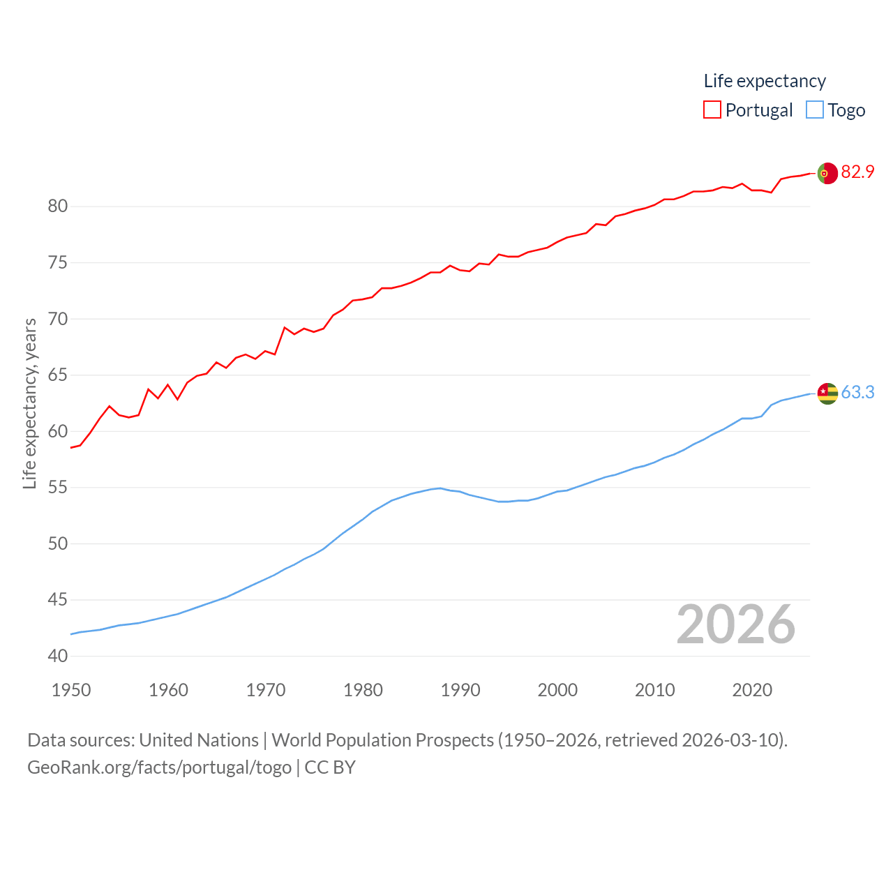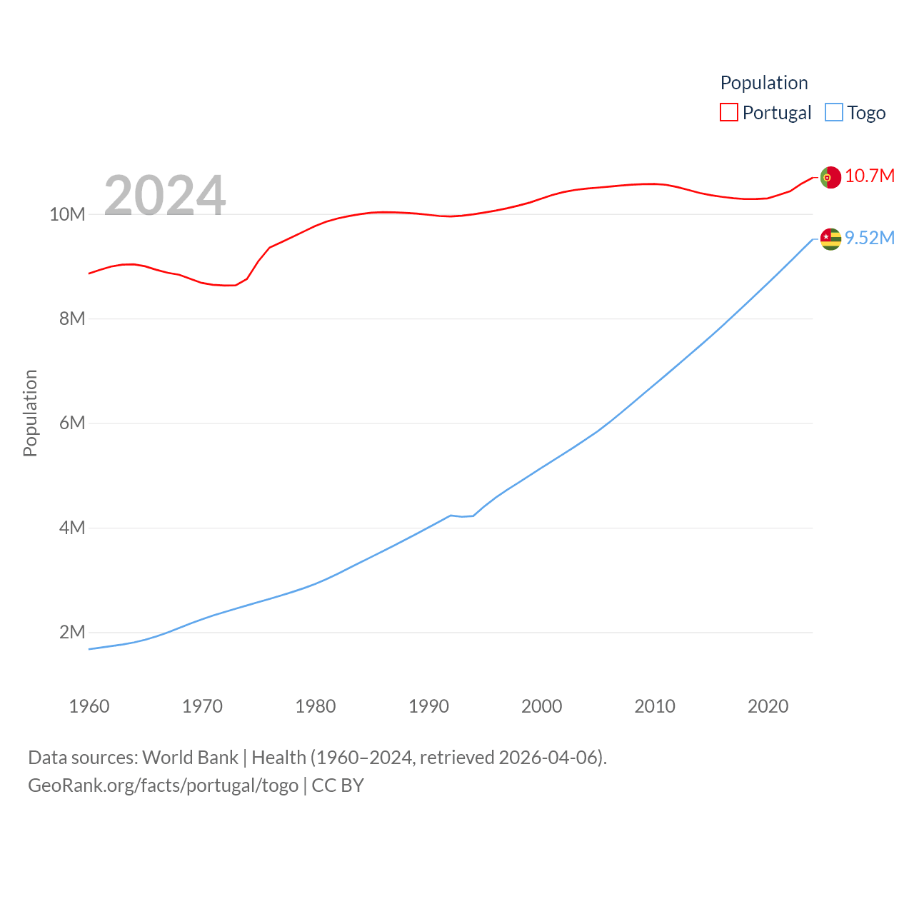 Portugal has a population of 10.7M (ranked 90/197), compared with 9.52M in Togo (ranked 98/197). Portugal's land area is 35,369 sq mi versus 21,000 sq mi for Togo (ranked 108th vs. 124th).
