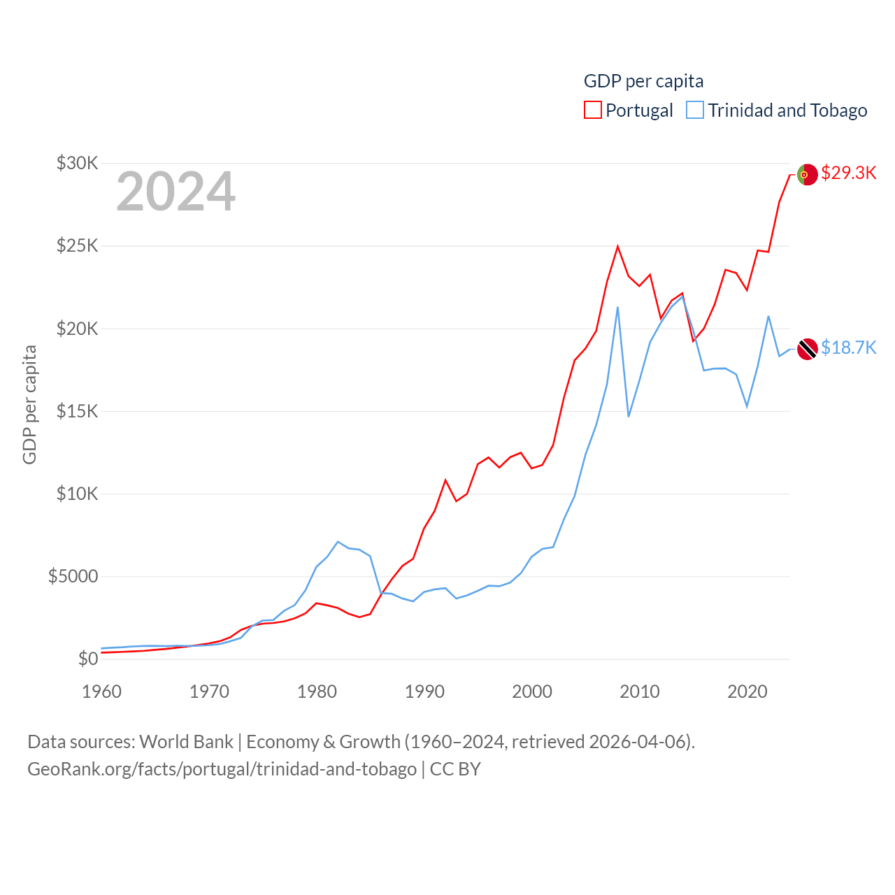 By GDP, Portugal ranks 46/197 ($313B) and Trinidad and Tobago ranks 115/197 ($25.6B). By GDP per capita, Portugal ranks 44/197 ($29,292), while Trinidad and Tobago ranks 61/197 ($18,733).