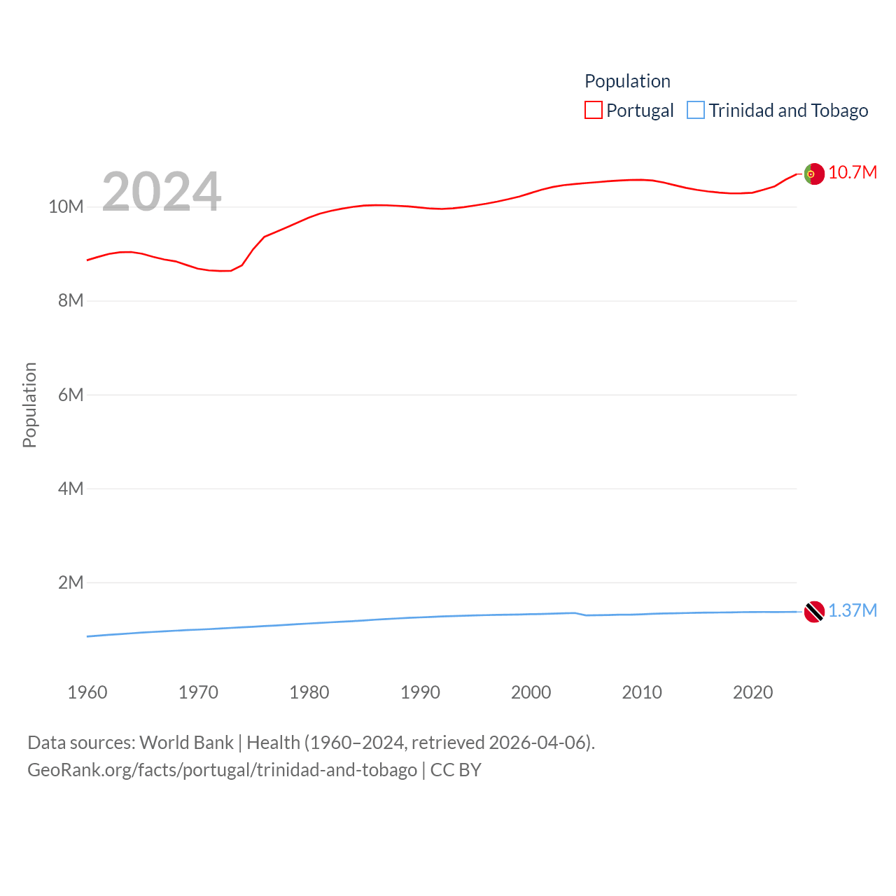 Portugal has a population of 10.7M (ranked 90/197), compared with 1.37M in Trinidad and Tobago (ranked 154/197). Portugal's land area is 35,369 sq mi versus 1,981 sq mi for Trinidad and Tobago (ranked 108th vs. 166th).