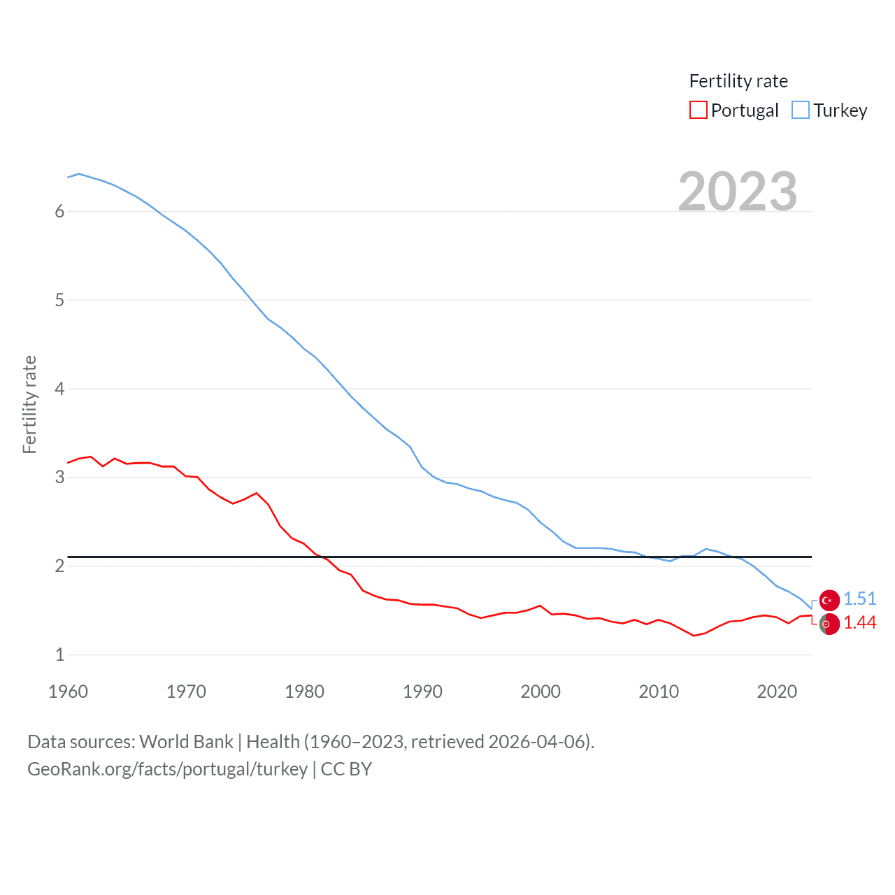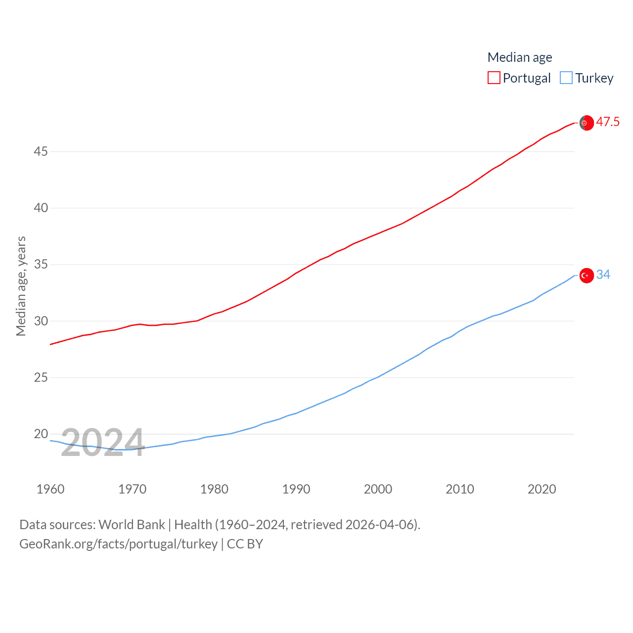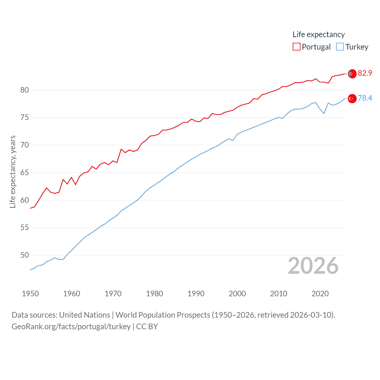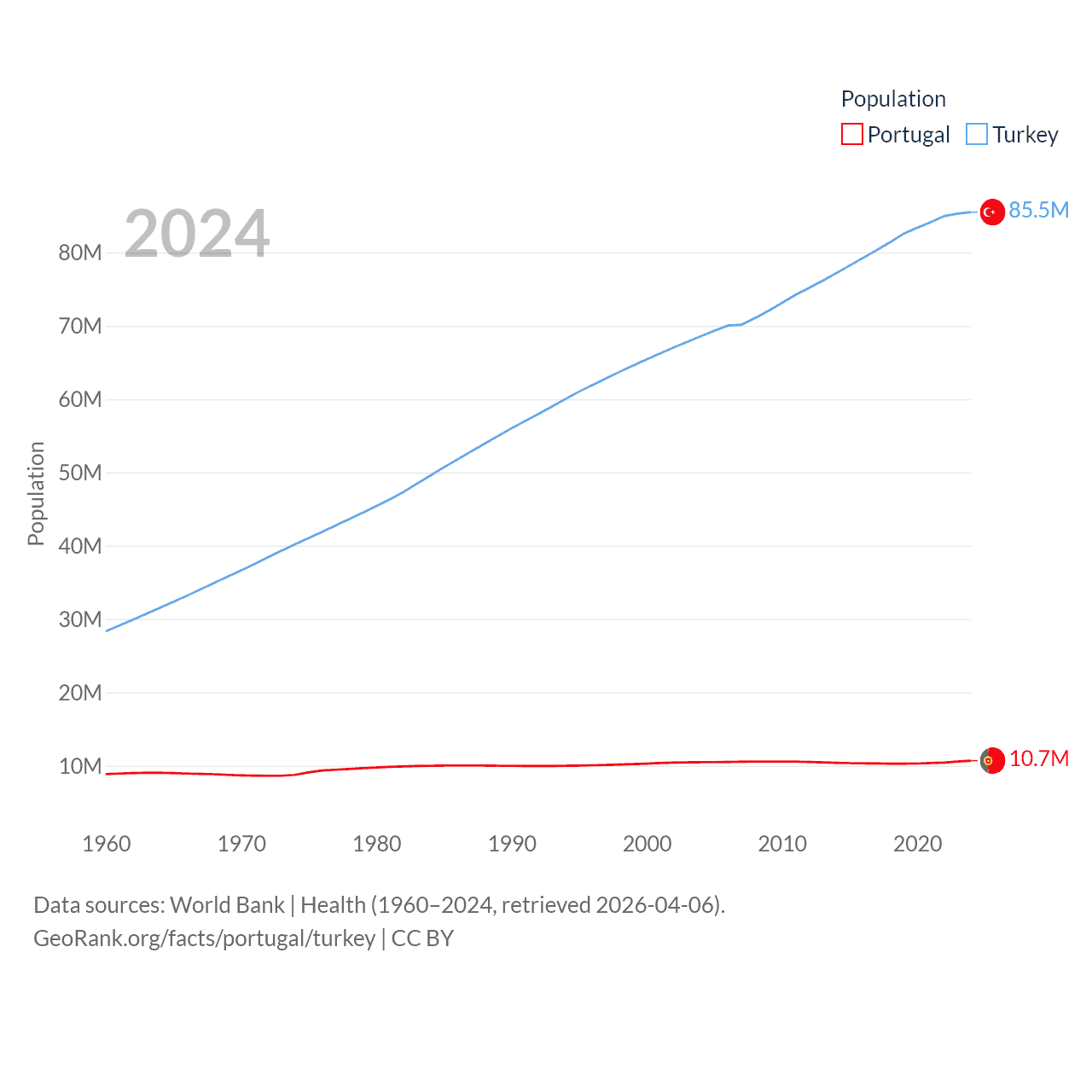 Portugal has a population of 10.7M (ranked 90/197), compared with 85.5M in Turkey (ranked 18/197). Portugal's land area is 35,369 sq mi versus 297,156 sq mi for Turkey (ranked 108th vs. 36th).