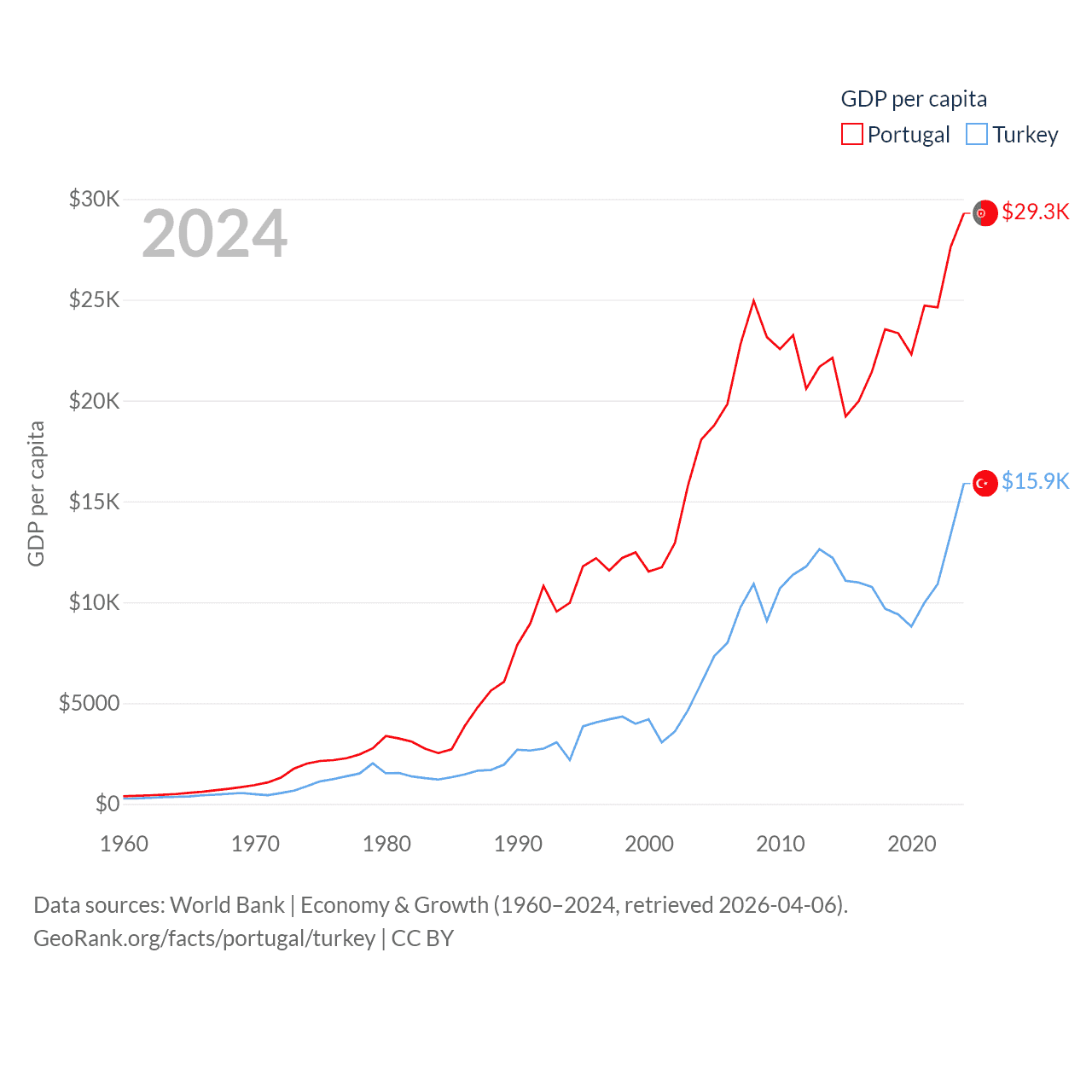 By GDP, Portugal ranks 46/197 ($313B) and Turkey ranks 17/197 ($1.36T). By GDP per capita, Portugal ranks 44/197 ($29,292), while Turkey ranks 66/197 ($15,893).