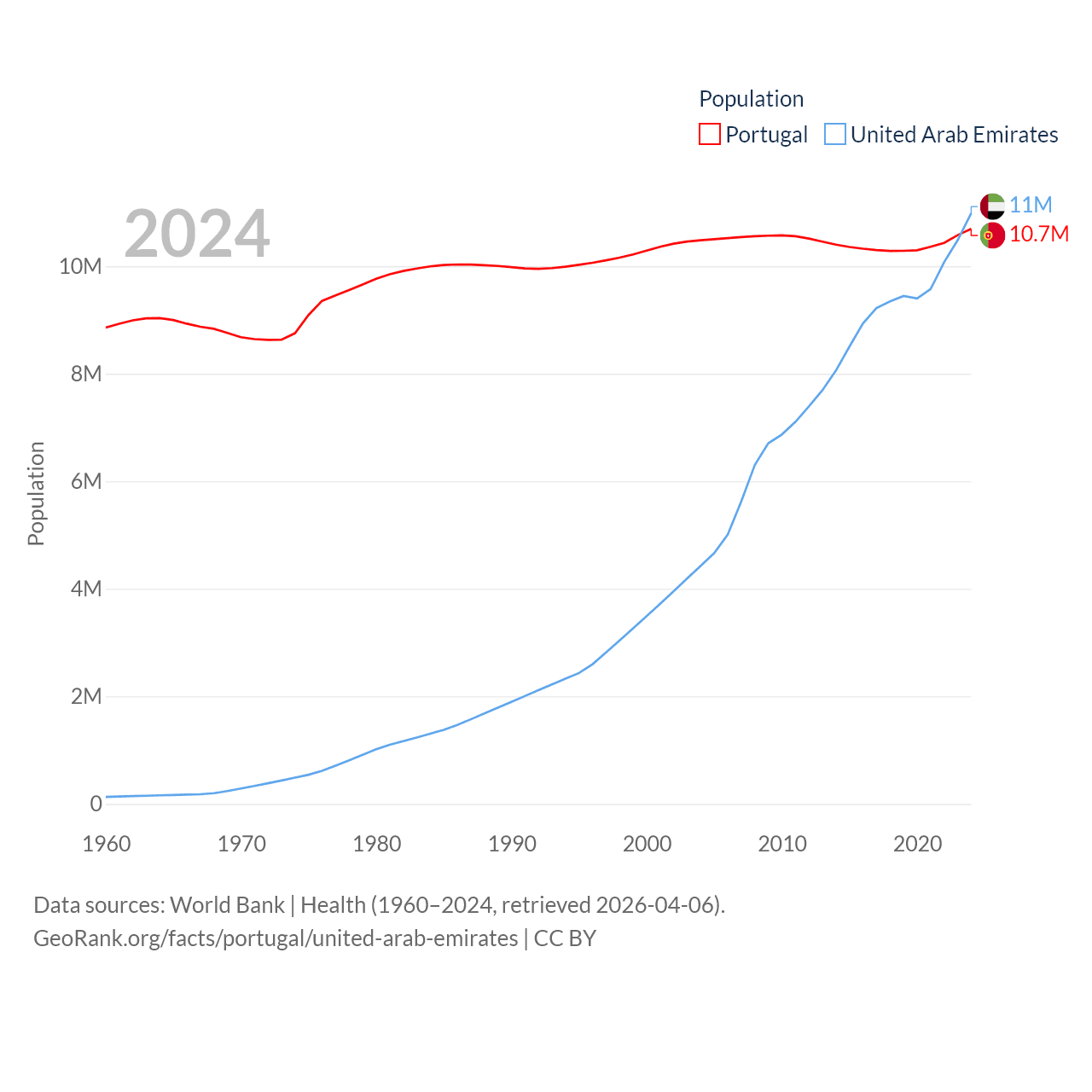 Portugal has a population of 10.7M (ranked 90/197), compared with 11M in The United Arab Emirates (ranked 86/197). Portugal's land area is 35,369 sq mi versus 27,421 sq mi for The United Arab Emirates (ranked 108th vs. 117th).